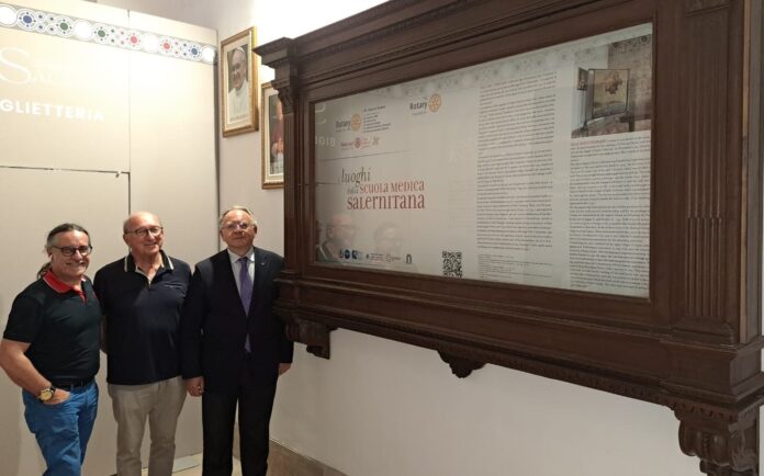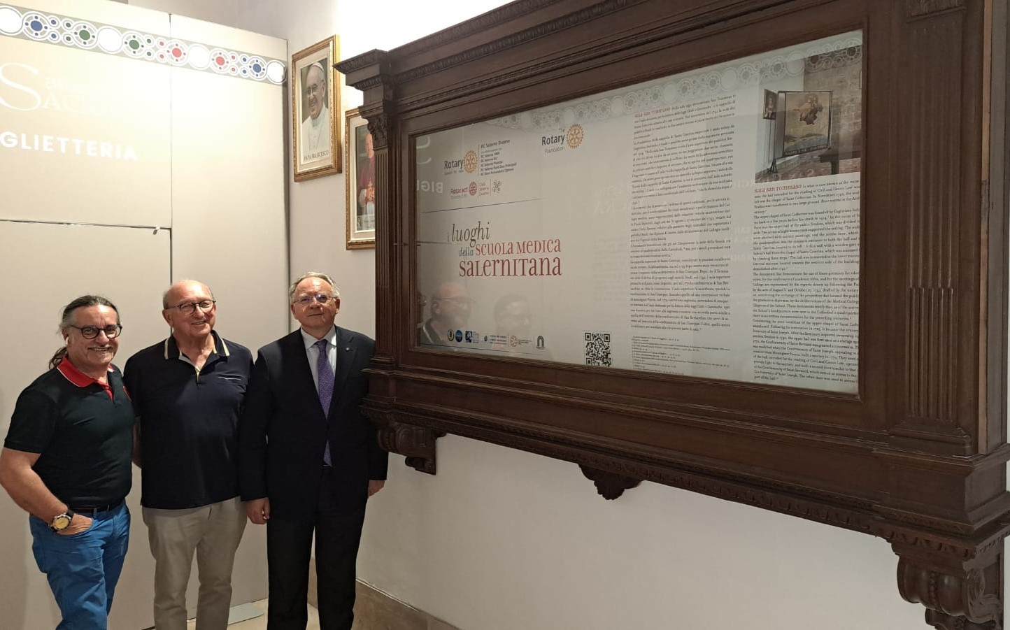 Un’antica leggenda racconta che in una notte di tempesta un pellegrino greco di nome Pontus, arrivato nella città di Salerno, avesse trovato rifugio per la notte sotto gli archi dell’antico “Acquedotto Medievale” di via Arce, meglio conosciuto come il “Ponte dei Diavoli”, che, secondo un’altra leggenda, fu costruito in una notte dal Mago Pietro Barliario in combutta con il diavolo. A Pontus si aggiunse un altro viandante, il latino Salernus, che era ferito, e poi ancora altri due viandanti: l’ebreo Elinus e l’arabo Abdela. Tutti si avvicinarono a Salernus per verificare lo stato della sua ferita e comprendere come la stesse curando. Scoprirono così di essere tutti e quattro dei medici e, durante la notte, decisero di fondare una scuola di medicina: la “Scuola Medica Salernitana”. L’ Acquedotto Medievale di Salerno è quindi uno dei luoghi legati alla “Scuola Medica Salernitana”, ma tanti altri ce ne sono: l’Abbazia di San Benedetto; il “Museo Virtuale della Scuola Medica Salernitana”, la Cappella Palatina di San Pietro a Corte; il “Museo Diocesano”, il “Museo Papi”, in Via Trotula de Ruggiero, dove si conservano antichi strumenti chirurgici;  il “Giardino della Minerva”;  la “Sala San Lazzaro” in Piazza Alfano I e la “Sala San Tommaso”  nell’atrio del Duomo, che era destinata per le attività didattiche, il conferimento dei diplomi di laurea in pergamena, e per le riunioni del Collegio medico. Proprio nella grande bacheca lignea della  “Sala San Tommaso” è stato inserito il grande pannello che ne racconta la storia, dal  Prefetto Distrettuale Francesco Dente, dal Prefetto di Club Alfonso Giordano e dal presidente del “Rotary Club Salerno Duomo, l’ingegnere Sabato Cuozzo: “Questo pannello, insieme a dieci paline descrittive con bacheca,  fa parte del progetto distrettuale denominato  “Valorizziamo i luoghi della Scuola Medica Salernitana” che, peraltro, insistono quasi totalmente intorno all’icona principale della nostra città, il Duomo, che ha ispirato anche il nostro Club Rotary nella scelta del nome. Le paline, posizionate nei luoghi che in qualche modo sono legati alla “Scuola Medica Salernitana”, e anche alla Stazione Marittima e presso la Stazione Ferroviaria (quelle descrittive del percorso) hanno l’obiettivo di raccontare ai turisti che visitano la nostra città, ma anche ai salernitani, la storia di questi luoghi”. Il progetto, è stato  ideato e curato dal “Rotary Club Salerno Duomo”, dal “Rotaract Club Salerno Duomo”, presieduto dal dottor Sergio Rosa, con la collaborazione dei Club Rotary: “Salerno”, “Salerno Est”, “Salerno Picentia”, “Salerno Nord dei Due Principati”, “Torre Annunziata Oplonti” ed il sostegno del  “Distretto Rotary 2101”, presieduto dal Governatore Ugo Oliviero, della “Rotary Foundation”, del “Comune di Salerno”; dalla “Soprintendenza Archeologica Belle Arti e Paesaggio di Salerno e Avellino”; dall’Ordine dei Medici di Salerno, dall’Ordine dei Commercialisti di Salerno  e dal Polo Museale “Salerno Opera”.