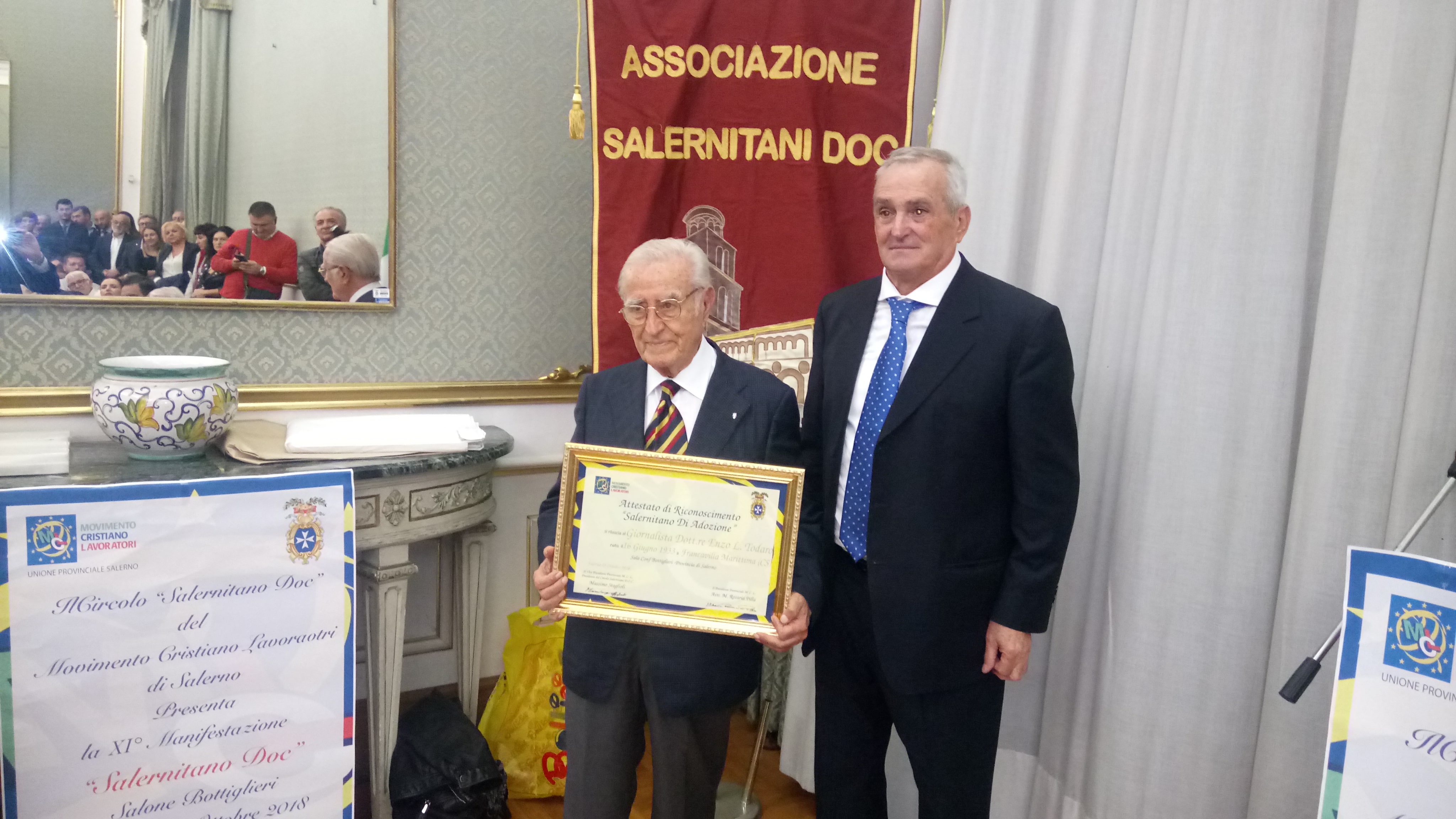 E’ stato il presidente dell’Associazione Salernitani Doc, Massimo Staglioli, a premiare, nel Salone Bottiglieri della Provincia di Salerno, come “Salernitano di Adozione”, il dottor Enzo Todaro, Presidente dell’Associazione Giornalisti Salernitani e Presidente del Club Panathlon Salerno, nato a Francavilla Marittima, in provincia di Cosenza, salernitano per scelta di vita, che da oltre sessant’anni vive nella nostra città che onora. Scrittore, poeta, autore di numerosi saggi e opinionista tv (da mercoledì, su Lira Tv, condurrà un programma dedicato ai personaggi importanti salernitani che intervisterà). Commendatore della Repubblica e Stella di Bronzo al Merito Sportivo, il dottor Todaro ha spiegato che è importante fare il giornalista nella massima libertà:” Con la schiena diritta, senza ascoltare la voce del potente di turno. Il mio padrone sono stati sempre e soltanto i lettori”. Un premio fortemente voluto dal Presidente del Premio “Salernitani DOC”, giunto all’XI Edizione, ideato e curato da Massimo Staglioli, Presidente del “Circolo Salernitani DOC” che ha deciso di premiare ogni anno un personaggio illustre che pur non essendo nato a Salerno, ha fatto tanto per la nostra città. Oltre sessanta i “Salernitani Doc” che durante la serata, presentata in modo brillante da Lucia Quaranta ed Ersilia Gillio, sono stati premiati sotto il nuovo labaro dell’Associazione Salernitani Doc. Cittadini salernitani “veraci” che con orgoglio hanno saputo identificarsi con la loro terra d’origine; uniti da un forte sentimento d’amore e di appartenenza alla loro città che onorano quotidianamente in vari campi lavorativi. Dopo un minuto o di raccoglimento, dedicato al compianto Roberto Guariglia, e la preghiera di Don Biagio Napolitano, Vicario del Vescovo, che ha ricordato l’importanza del lavoro:” E’ fondamentale per la dignità che noi riconosciamo alla persona. I Salernitani DOC fanno grande la nostra città”; ci sono stati i saluti della professoressa Mariarosaria Vitiello, Consigliere Politico della Provincia di Salerno, che ha affermato: ”Il premio “Salernitani DOC, rappresenta l’essenza della salernitanità: Un premio identitario dato a persone comuni che si sono distinte facendo il loro lavoro quotidiano; che portano avanti la nostra società e fanno crescere il nostro senso di comunità” e dell’avvocato Maria Rosaria Pilla, Presidente Provinciale del Movimento Cristiano Lavoratori, nato per volontà di Paolo VI. “Il premio è un riconoscimento alla salernitanità”- ha spiegato l’avvocato Pilla – ” Un premio che sottolinea il senso di appartenenza alla città, che premia le persone che si sono impegnate nel mondo del lavoro e che rappresentano la centralità dell’uomo”. Il Presidente Massimo Staglioli ha ricordato, emozionato, com’è nato il Premio “Salernitani Doc:” Proprio in questa sala, nel 2008: lanciai allora un piccolo sassolino che oggi è diventato un grande cerchio nel mare di Salerno. Vedo in sala tanta gente che sente l’attaccamento alla propria città e questo per me è motivo di grande orgoglio”. Staglioli ha anche annunciato che nel 2019 sarà ufficializzata la nascita dell’Associazione Culturale Salernitani DOC: ” Ciascun salernitano potrà contribuire con azioni, pensieri e attività a rendere sempre più forte il senso idi identità e di appartenenza a questa città”.