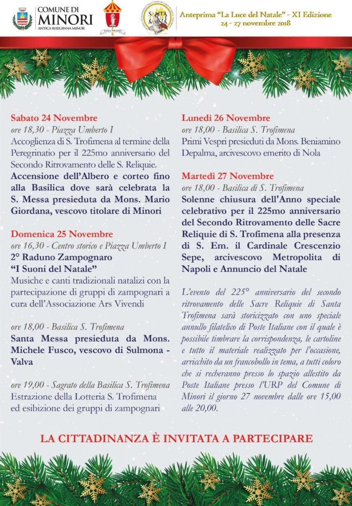 La manifestazione avrà inizio alle ore 16:00 con il giro del paese degli zampognari partecipanti che faranno riecheggiare nell’aria le dolci nenie natalizie. Alle ore 18 i presenti parteciperanno presso la basilica di Santa Trofimena alla messa presieduta da Sua Eccellenza Monsignor Michele Fusco vescovo di Sulmona- Valva. Al termine,i gruppi si esibiranno sul sagrato della Basilica eseguendo le loro caratteristiche melodie. Per tale occasione sarà, anche, presente a Minori nei giorni 24 e 25 novembre il consorzio del Sannio con alcuni suoi rappresentanti: