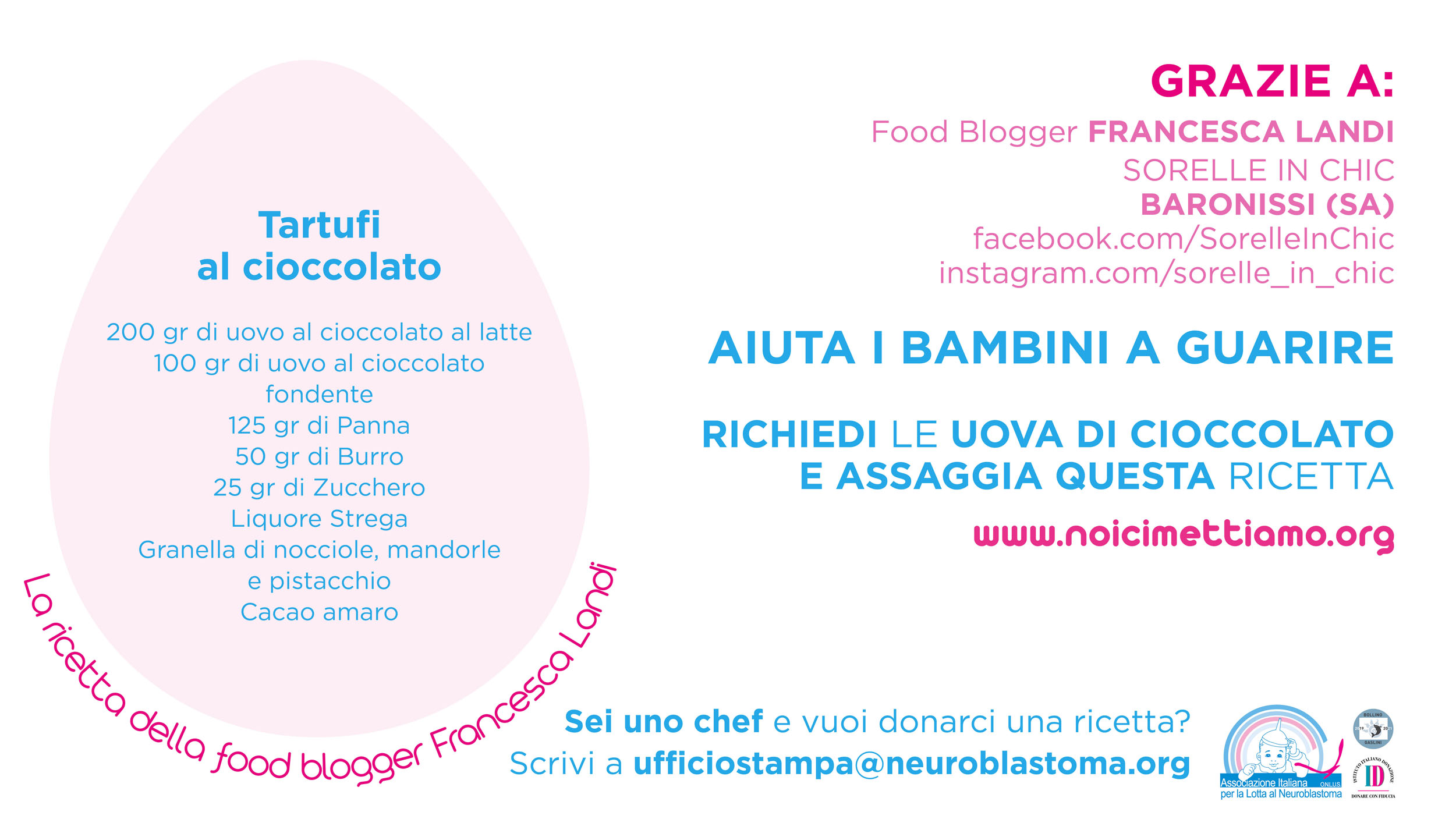 Testimonial dalla Campania è anche la food blogger Francesca Landi con la ricetta “Tartufi al Cioccolato”. Con la passione per la cucina e il buon cibo, che ha ereditato dalla madre, una donna forte e positiva, che proviene da una famiglia di fornai e le ha insegnato a fare i dolci, Francesca ha creato, insieme alla sorella Barbara, il blog “Sorelle in chic”. Il panificio di famiglia è stato parte integrante della loro infanzia trascorsa a giocare tra sacchi di farina e il profumo del pane appena sfornato. Momenti che portano nel cuore e che sono stati nutrimento per la loro anima, perché la cucina aiuta a stimolare pensieri positivi, anche quando si è inquieti e tristi e diviene cura per sé e per gli altri, come atto d’amore da donare. Questo lo spirito del blog, che si è ispirato alla madre, che ha affrontato la dolorosa perdita di un figlio, tuffandosi tra i fornelli, per ritrovare la forza di ricominciare. Sorelle in chic è diventato community, condivisione, interazione intorno al tema della cucina come divertimento, tra tradizione e innovazione, sempre con uno sguardo alle ricette di famiglia, ai dolci che profumano di nonna, di buono, di semplicità, ma anche “un viaggio dentro di sé, alla ricoperta delle proprie radici, per non dimenticare il ricordo e per dargli nuova linfa vitale”.