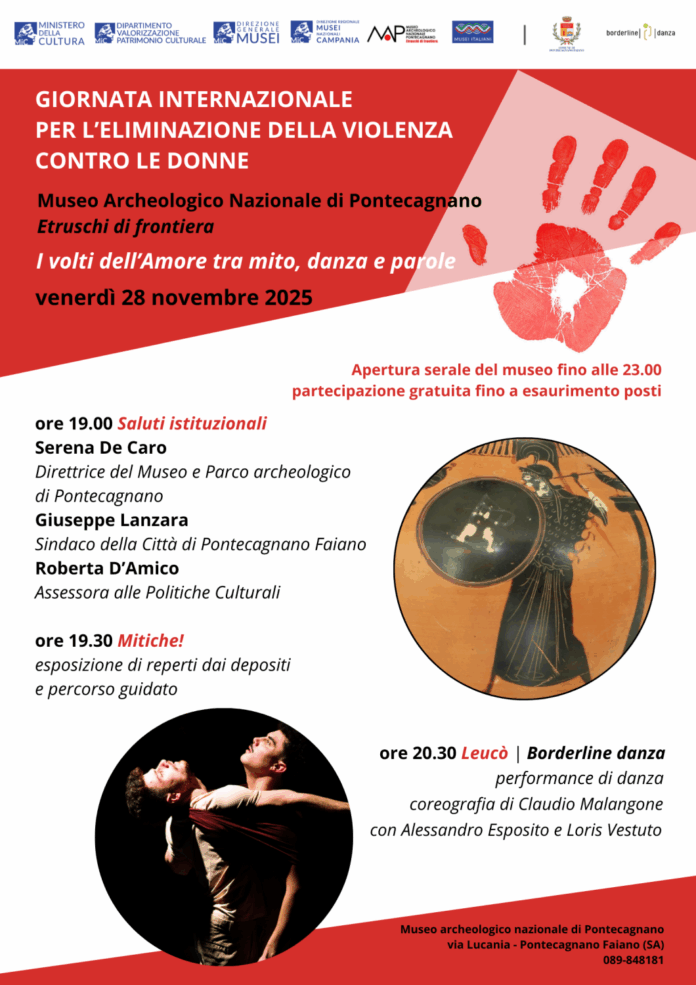 Venerdì 28 novembre 2025, in occasione della Giornata internazionale per l’eliminazione della violenza contro le donne, il Museo Archeologico Nazionale di Pontecagnano, in sinergia con il Comune di Pontecagnano Faiano, prosegue l’impegno assunto in questi anni nella diffusione della cultura del rispetto e della libertà contro ogni forma di violenza di genere con un’apertura straordinaria serale dedicata all’evento “I volti dell’Amore tra mito, danza e parole”.