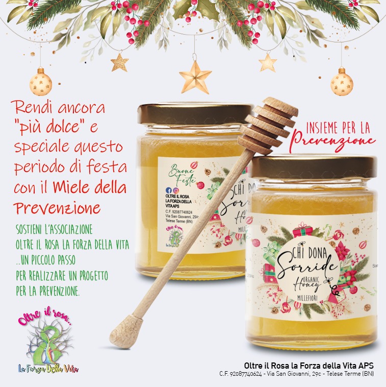 Con un’offerta di 10 euro sarà possibile prenotare entro il 24 dicembre un vasetto di miele di acacia e di millefiori prodotto da apicoltori locali, per sostenere le campagne di prevenzione dei tumori che l’associazione Oltre il Rosa la Forza della Vita APS porta avanti su tutto il territorio della Campania.