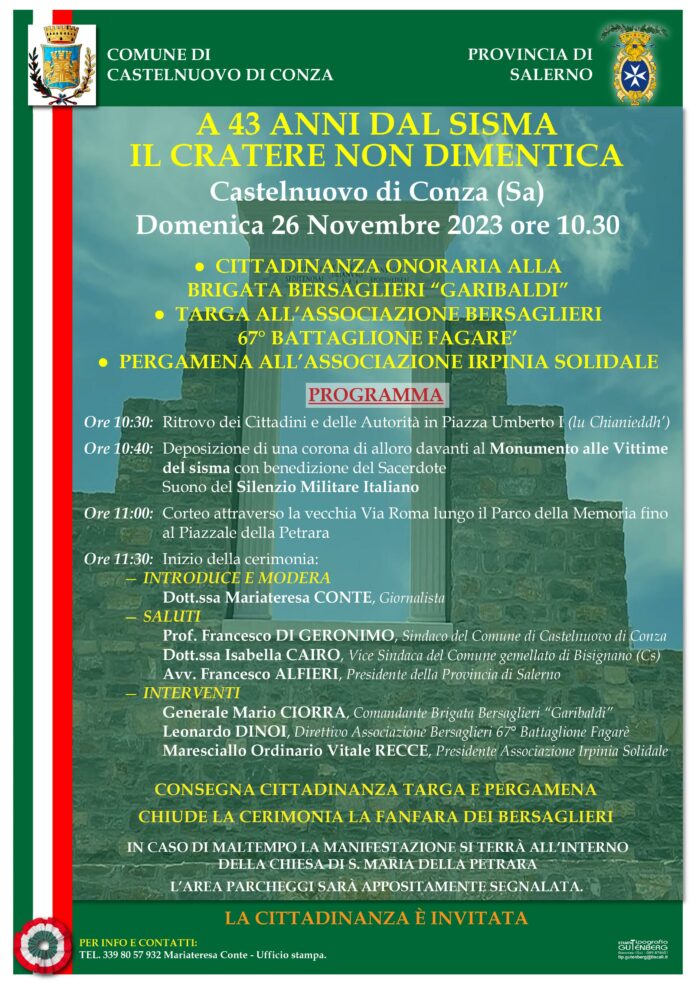 “A 43 anni dal sisma del 1980, il Cratere non dimentica”. S’intitola così, l’evento che si svolgerà a Castelnuovo di Conza, nel salernitano, domenica 26 novembre 2023 alle ore 10.30 e che vedrà il Comune, i sindaci del cratere salernitano e il popolo della Valle del Sele e Tanagro, ricordare le vittime della tragedia del sisma del 23 novembre 1980 e incontrare e ringraziare i militari e gli ex militari provenienti da tutta Italia che 43 anni fa giunsero nei paesi terremotati dell’Irpinia e del Salernitano, prestando aiuto e soccorso alle popolazioni. Una cerimonia di alto valore istituzionale, voluta dal sindaco del comune di Castelnuovo di Conza, Francesco Di Geronimo, in collaborazione e con il patrocinio dell’Ente Provincia di Salerno, che vedrà la presenza tra le più alte cariche civili e militari del territorio regionale e del Mezzogiorno, nella quale il Comune di Castelnuovo di Conza conferirà, come da delibera di giunta comunale n.53 del 26.10.2023, la cittadinanza onoraria alla Brigata Bersaglieri “Garibaldi” di Caserta, una targa all’Associazione Bersaglieri “67° Fagarè” e all’Associazione “Irpinia Solidale”. I saluti saranno affidati al sindaco di Castelnuovo di Conza, Francesco Di Geronimo, al vicesindaco del Comune gemellato della città di Bisignano (Cosenza), Isabella Cairo, e al Presidente della Provincia di Salerno, Francesco Alfieri. La manifestazione inoltre, sarà presentata dalla giornalista salernitana Mariateresa Conte. A ritirare la cittadinanza onoraria, il generale Mario Ciorra, comandate della Brigata Bersaglieri “Garibaldi” di Caserta, accompagnato dai militari della fanfara. A ritirare la targa di benemerenza invece, Leonardo Dinoi, ex militare bersagliere e componente del direttivo dell’Associazione Nazionale Bersaglieri “67° Fagarè” che insieme a centinaia di militari, bersaglieri e non, in servizio a Persano nel 1980 e di cui una rappresentanza sarà presente alla cerimonia del 26 novembre, prestarono servizio nei paesi terremotati del cratere. Ritirerà la pergamena di ringraziamento per l’attività nel sociale, di solidarietà e sostegno alle popolazioni dell’Irpinia e dell’Alto e Medio Sele, il maresciallo ordinario dell’Esercito italiano in servizio presso il comprensorio militare di Persano e presidente dell’associazione no-profit “Irpinia Solidale”, Vitale Recce. In caso di avverse condizioni climatiche, la manifestazione si svolgerà presso la chiesa di Santa Maria della Petrara. ‹‹La cerimonia di conferimento della cittadinanza onoraria alla Brigata Bersaglieri e delle targhe al 67° Fagarè e ad Irpinia Solidale -dice il sindaco di Castelnuovo di Conza, Francesco Di Geronimo- racchiude la memoria di una grande tragedia che ha segnato per sempre la vita degli abitanti del cratere salernitano, portando dietro di sé morte e distruzione, ma anche la riconoscenza verso quegli angeli terreni, quei giovani militari di Persano e i tanti volontari che da tutta Italia giunsero nei comuni terremotati per portare aiuto e sostegno alle popolazioni, oltre a contribuire a fare rialzare dalle macerie il nostro popolo. La nostra terra- dice il sindaco Di Geronimo, che proprio qualche anno fa ha siglato un gemellaggio con la città di Bisignano, in provincia di Cosenza, da dove decine di cittadini calabresi partirono per soccorrere la popolazione terremotata di Castelnuovo di Conza- non ha mai dimenticato quei volti e quegli occhi che riabbracceremo e ringrazieremo proprio alla cerimonia del 26 novembre. L’Esercito italiano ed in particolar modo, i Bersaglieri, ebbero un ruolo centrale negli aiuti alla popolazione terremotata. Soccorsi -conclude il sindaco- che ancora oggi, dimostrano quanto sia importante il lavoro dei militari dell’Esercito Italiano e di tutte le Forze Armate del nostro Paese, in Italia e nel mondo, non soltanto nelle missioni di pace ma anche negli aiuti umanitari e di vicinanza alle popolazioni durante le catastrofi naturali››.