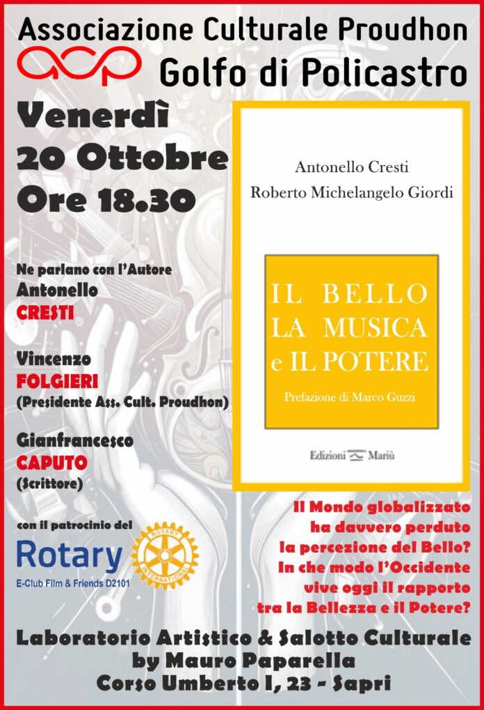 Venerdi 20 ottobre alle ore 18.30, in Corso Umberto I n.23, presso il Laboratorio Artistico e Salotto Culturale di Mauro Paparella, l’Associazione Culturale Proudhon con il patrocinio del Rotary E-Club Film & Friends Distretto 2101, presenterà il libro di Antonello Cresti e Roberto Michelangelo Giordi “Il bello, la musica e il potere” edito per le Edizioni Mariù. Sarà presente Antonello Cresti con cui dialogherà Gianfrancesco Caputo saggista e scrittore, introdurrà la serata Vincenzo Folgieri Presidente dell’Associazione Culturale Proudhon.