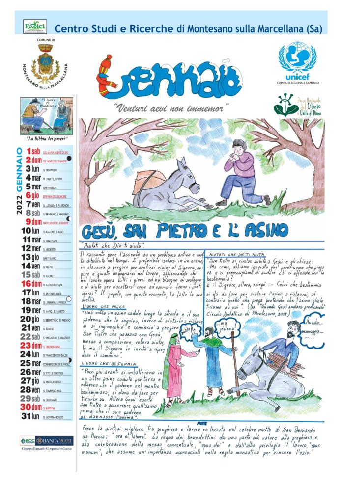 Tutto questo appare evidente nei vari mesi del Calendario di Montesano 2022, attraverso i vari racconti tra i quali “Gesù, San Pietro e l’asino”, “San Pietro e la parola di Dio”, “Il contadino e il pero”, “La Madonna di mezz’agosto”, e “Il voto”.