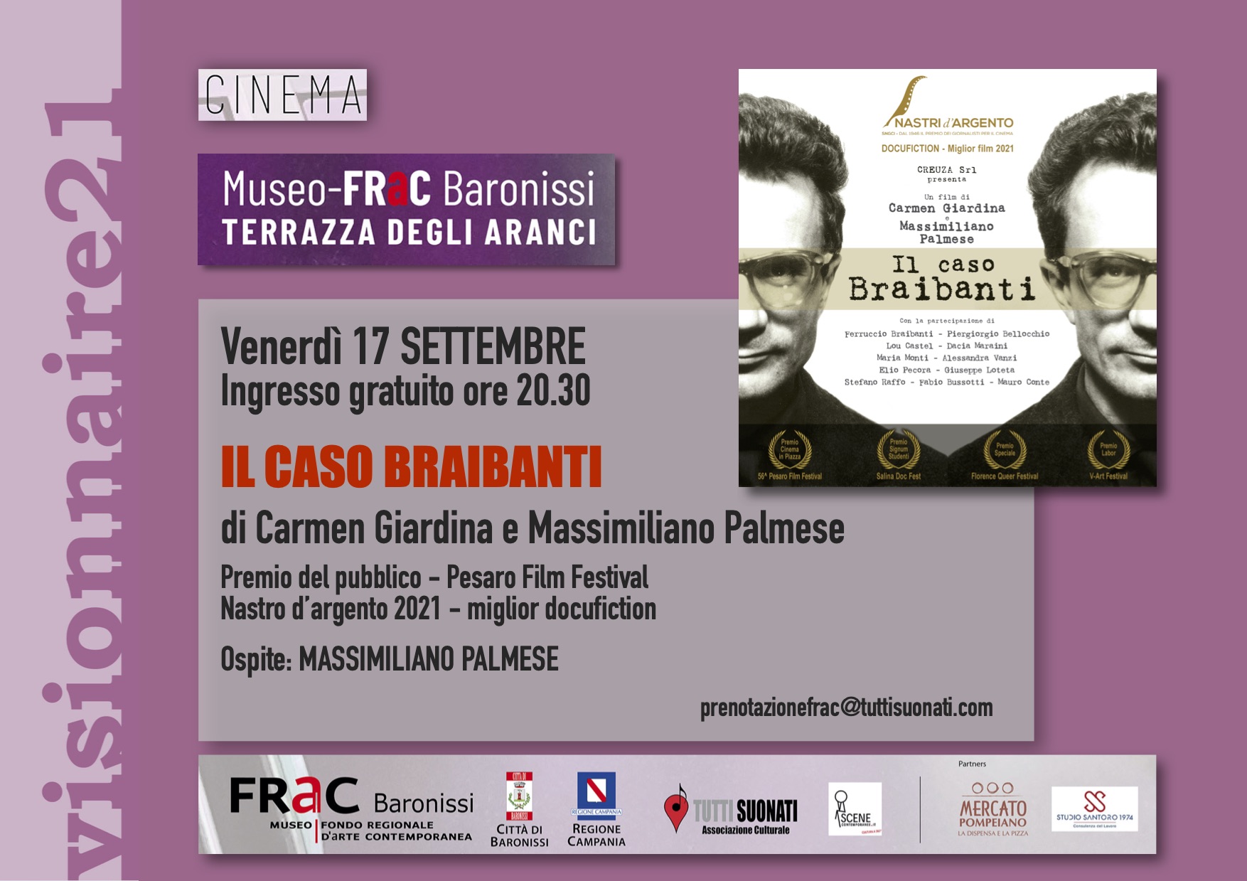 “Le sue idee visionarie sulla famiglia, il potere, la convivenza tra specie viventi, i pericoli di grandi condizionamenti mediatici e quello di fortissimi cambiamenti climatici, sono il segno dell’estremo interesse dell’opera di Braibanti, uomo dimenticato, ma forse oggi un pò meno”, sottolinea il regista e scrittore Massimiliano Palmese, che dopo la proiezione si intratterrà al Museo FRaC in un dibattito confronto con il pubblico e il direttore artistico Visionnaire Andrea Avagliano.