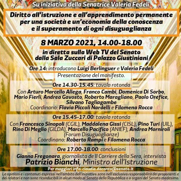 Si è tenuto in diretta sulla Web Tv del Senato della Repubblica, nella prestigiosa Sala Zuccari di Palazzo Giustiniani, una tavola rotonda e a seguire un incontro dibattito su “Diritto all’istruzione e all’apprendimento permanente per una società e un’economia della conoscenza e il superamento di ogni disuguaglianza”, il primo incontro con sindacati, stampa , docenti e dirigenti collegati da tutta Italia , numerosi in particolare dalla Campania, con il neo Ministro dell’Istruzione Patrizio Bianchi.