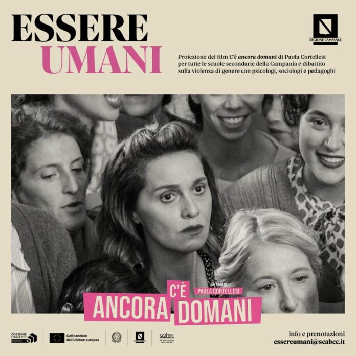 Dopo i primi appuntamenti nei cinema di Napoli lo scorso mese di dicembre, il progetto regionale – che vede la compartecipazione dell’Assessorato alla Scuola, Politiche Sociali, Politiche Giovanili, della Direzione Generale per le Politiche Sociali e Socio-Sanitarie e della Direzione Generale per le Politiche Culturali e il Turismo, attuato dalla Scabec (Fondi PR Campania FSE+ 2021-2027) – ripartirà lunedì 22 gennaio coinvolgendo migliaia di studenti nella proiezione del film C’è ancora domani di Paola Cortellesi, seguita da un dibattito a cui prenderanno parte psicologi esperti sulla tematica: un ciclo di circa 600 proiezioni del film, riservate agli alunni delle scuole secondarie di primo e secondo grado, in oltre 30 cinema in tutta la Campania.