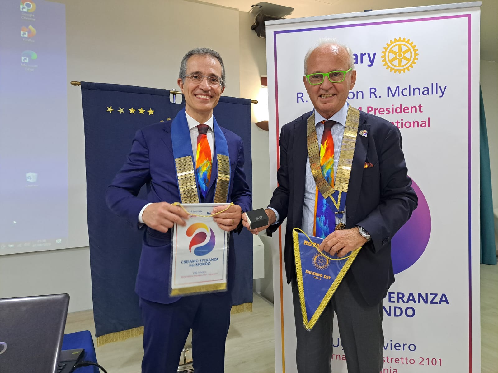 Il Governatore del “Distretto Rotary2101”, il dottor Ugo Oliviero, specialista in Cardiologia, in Medicina Interna e in Geriatria, nella sua prima visita ai Club Rotary salernitani ha incontrato il presidente e i soci del “Rotary Club Salerno Est” e i giovani rotaractiani del Club, durante la conviviale organizzata presso l’Hotel Mediterranea di Salerno. Oliviero, dopo i saluti del presidente Camillo de Felice, che ha letto il ricco curriculum del Governatore e illustrato alcuni dei progetti che saranno messi in campo dal “Rotary Club Salerno Est”, ha ricordato i principi ispiratori dell’azione rotariana e il motto del Presidente del Rotary International, per l’anno sociale 2023/2024, lo scozzese Gordon R. McInally, presentato in occasione dell’Assemblea Internazionale del Rotary di Orlando: “Creiamo speranza nel mondo”. “Questo motto” – ha spiegato il Governatore Oliviero – “richiama il tema della speranza, intesa come precondizione di qualsiasi azione rotariana. La speranza come motore di ottimismo, che permette di vedere al di là della tempesta e di pianificare ed agire con lungimiranza ma, al tempo stesso, con pragmatismo e ragionevolezza”. Oliviero ha anche ricordato il suo motto, quello del “Distretto Rotary 2101”: “Il Rotary delle Comunità”:” Comunità intese come aggregazioni solidali di persone intorno ad un ideale: insieme di persone unite al territorio, dalla lingua, dalla storia comune, che hanno comunione di vita sociale e condividono gli stessi comportamenti ed interessi, che professano la medesima confessione religiosa. Il Rotary deve essere espressione delle Comunità e recepirne i bisogni. Tutti noi crediamo in un mondo dove i popoli, insieme, “promuovano cambiamenti positivi e duraturi nelle comunità vicine, in quelle lontane, in ognuno di noi”. Dobbiamo operare insieme per rendere sempre di più il Rotary un’organizzazione aperta ed inclusiva”.