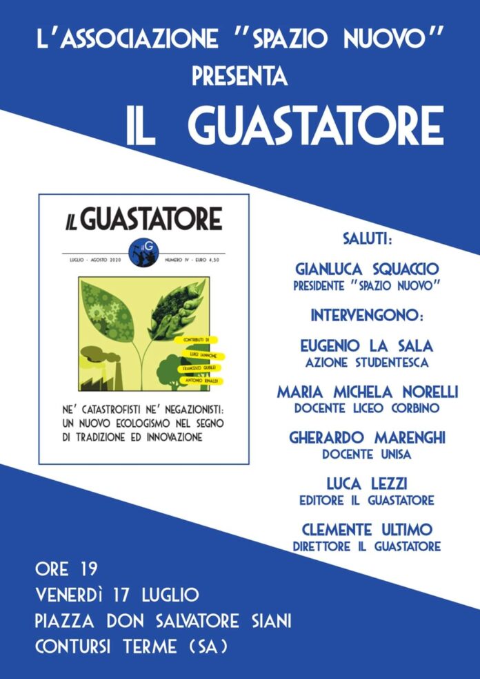 Presidente dell’Associazione Culturale “SPAZIO NUOVO” Gianluca Squaccio, discuteranno degli Argomenti trattati in questi primi quattro numeri della rivista Eugenio La Sala di Azione Studentesca, Maria Michela Norelli docente Lettere Antiche Liceo Corbino di Contursi T., il docente di Diritto all’Università di Salerno Gherardo Marenghi collaboratore ed animatore de IL GUASTATORE, il caporedattore Luca Lezzi. Le conclusioni dell’incontro saranno affidate al direttore Clemente Ultimo.