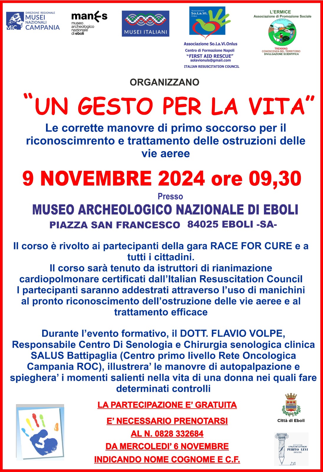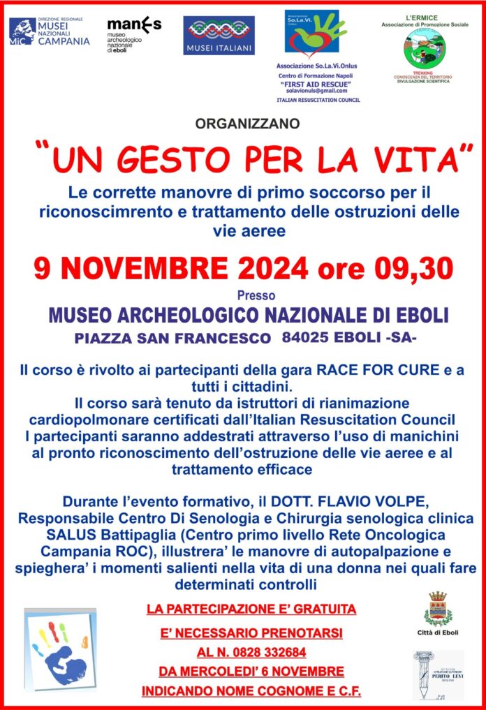 A seguire, a partire dalle ore 9,30, si terrà Un gesto per la vita, un corso sulle corrette manovre di primo intervento per il riconoscimento e il trattamento delle ostruzioni delle vie aeree, a cura dell’Associazione SO.La.Vi. Onlus di Napoli. Il corso sarà tenuto da istruttori di rianimazione cardiopolmonare certificati dall’Italian Resuscitation Council e prevederà il rilascio di un attestato di partecipazione.