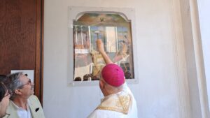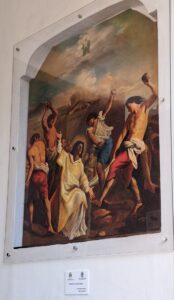 Il noto critico d’arte salernitano Gerardo Pecci ha spiegato il significato religioso dell’opera del Maestro Di Renzo:” Ci trasporta nel cuore della cristianità. L’artista, che in questo dipinto si è rifatto alla cultura tardo manierista, barocca del ‘600, con colori forti e brillanti, ha saputo cogliere il momento in cui il Santo sta per essere martirizzato, mentre sta per essere colpito dalle pietre; guarda in alto verso il cielo dove c’è Gesù che lo attende; che attende il suo primo martire. Quest’opera d’arte trasmette delle emozioni vive che nascono nel cuore che si riempie di amore e di emulazione nei confronti di Gesù. Santo Stefano è colui che incarna il lungo cammino che ci ha portato alla contemporaneità”. Il Maestro Costantino Di Renzo ha spiegato di aver realizzato la sua opera con la tecnica dell’olio su tela:” Rispettando la sagoma dell’edicola votiva, la sobrietà degli elementi e quella patina di antico in linea con il contesto”. La storica dell’arte Carla Di Renzo, figlia dell’artista teatino, ha spiegato che l’Arte è un modo di comunicare:” A volte funge anche da strumento di educazione. In quest’opera lo stile riecheggia l’arte manierista del pieno’600 e l’arte caravaggesca”. (Foto di Giuseppe Carabetta).