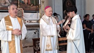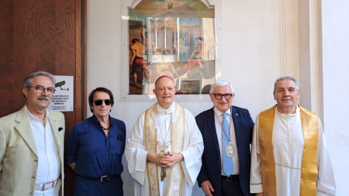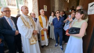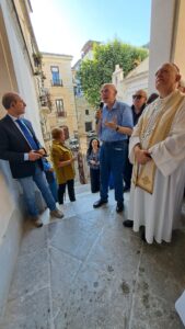 E’ stato Monsignor Andrea Bellandi , Vescovo di Salerno, accolto nella Cappella Palatina di San Pietro a Corte dalle note del “Jubilate Deo”, eseguito dal coro “ Schola Cantorum Sanctus Petrus ad Curtim”, diretto dal Maestro Ermenegildo Guerra, a benedire l’opera, posta nell’edicola votiva all’ingresso della Cappella Palatina , intitolata “Il Martirio di Santo Stefano”, realizzata dal Maestro Costantino Di Renzo , artista di fama internazionale che all’inizio di quest’anno aveva esposto le sue opere presso la “Pinacoteca Provinciale” di Salerno in una Mostra curata dal dottor Giuseppe Carabetta. Il Vescovo Bellandi ha ricordato che Santo Stefano è stato il protomartire:” È il primo testimone. Il termine martire indica colui che è testimone, uno che dà testimonianza della sua appartenenza al Signore attraverso il sacrificio della sua vita. Come diceva San Paolo VI: “Il mondo forse non guarda più tanto ai maestri, ma guarda ai testimoni e se guarda ai maestri lo fa perché i maestri sono anche testimoni”. Santo Stefano è un maestro, ma è anche un testimone”. A ricordare la figura del Santo che ha sempre avuto un rilievo particolare nella raffigurazione iconografica legata al Cristianesimo e alla Chiesa, è stato Don Gerardo Bacco, assistente spirituale della “Confraternita di Santo Stefano”:” Santo Stefano è stato il primo che dopo Gesù e gli apostoli ha dato la vita per la nobile causa del Vangelo ed è il patrono della Confraternita”. L’opera raffigurante Santo Stefano, è stata commissionata dalla “Confraternita di Santo Stefano”, fondata nel 1566, presieduta dal Priore, il dottor Felice Pastore: “E’ la più antica confraternita di Salerno. Ha la sua sede nell’oratorio di San Matteo Piccolo, in Largo San Pietro a Corte, affianco alla chiesa di Santa Rita. Dal 1938 la Confraternita ha in comodato d’uso la Chiesa di San Pietro a Corte di proprietà della Curia Arcivescovile” L’archeologo Felice Pastore, che è anche presidente del “Gruppo Archeologico Salernitano”, coordina le visite guidate al Complesso monumentale di San Pietro a Corte, dove, come da lui annunciato, nel mese di ottobre sarà inaugurato un organo a canne di grande prestigio.
