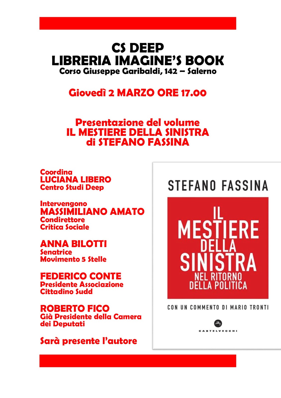 Si presenta giovedì 2 marzo ALLE 17.00 alla Libreria Imagine’s Book, “Il mestiere della sinistra Nel ritorno della politica” di Stefano Fassina, edito da Castelvecchi editore. Con l’autore dialogano Anna Bilotti e Roberto Fico del M5S; Federico Conte di Articolo 1 e il giornalista Massimiliano Amato; coordina Luciana Libero. Con questo saggio Stefano Fassina ricorda alla Sinistra il suo mestiere, gli interessi sociali da rappresentare e gli impegni da assolvere, un “mestiere” da tempo abbandonato e che ha lasciato le fasce più deboli del paese prive di rappresentanza e una astensione massiccia di una parte consistente dell’elettorato. La presentazione giunge in un particolare momento per l’area della sinistra; le elezioni di Elly Schlein alla segreteria del PD, determinate principalmente dal voto dei non iscritti, hanno contraddetto le indicazioni dominanti; in particolare nei nostri territori il cui voto non è libero ma pesantemente condizionato. Ma come ci racconta il libro di Fassina, la sinistra non è solo una questione di leadership e di alleanze ma di visione e di scelte politiche. Fassina chiede un europeismo consapevole e un atlantismo “adulto” che parta dalle necessità delle persone e non si appiattisca sull’adesione passiva alle scelte d’oltreoceano. Suggerisce di non tralasciare l’area intellettuale per poter affrontare la riconquista del primato della Politica sull’Economia. È la condizioneper ripristinare i valori della pace, e rinsaldare quei vincoli identitari, sociali e ambientali che devono sovrintendere ai movimenti di capitali, merci, servizi e persone. Ma soprattutto è necessario ritornare a mettere al centro il lavoroper superare le diseguaglianze rese ancora più gravi dalle politiche degli ultimi decenni. Tra le menti politiche più avvertite dell’area della sinistra italiana, Fassina rimette al centro la persona e riprende con vigore un discorso di sinistra le cui formazioni storiche sono dominate dalle questioni interne alle proprie organizzazioni, come nel caso del Partito Democratico o si sono disperse in mille rivoli ininfluenti e incapaci di affrontare le grandi sfide che il mondo ci impone. La presentazione salernitana di giovedì promossa dal gruppo DEEP, con la presenza di autorevoli esponenti della politica italiana, rilancia un discorso di sinistra, nella città dove le indicazioni dei gruppi dominanti hanno premiato Bonaccini con il 79% dei voti. Un appuntamento da non mancare che riapre la discussione in una città assopita e dominata da più di trenta anni dal medesimo gruppo di potere. Economista e deputato della Repubblica, Stefano Fassina è stato viceministro dell’Economia e delle finanze nel governo Letta. Con lui intervengono Roberto Fico già Presidente della Camera e rappresentante del M5S; la senatrice Anna Bilotti del M5S, Federico Conte, Associazione Cittadino Sud, Massimiliano Amato, giornalista. Coordina la giornalista Luciana Libero.