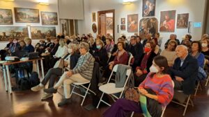 La professoressa Ada Patrizia Fiorillo ha raccontato che Canova era un uomo coltissimo” Conosceva ben quattro lingue” e ripercorso gli anni della giovinezza del Canova, dal 1757 al 1772; quelli della sua formazione a Venezia – “dove s’iscrisse all’accademia del nudo” – gli anni del periodo romano, quelli della sua esperienza di Parigi – ” Durante la quale conosce Napoleone Bonaparte, che ritrae in un busto marmoreo, ed anche la sorella Paolina Bonaparte Borghese che scolpisce come una Venere vincitrice seguendo la tradizione delle Veneri sdraiate”. La professoressa Fiorillo ha anche raccontato del viaggio a Londra di Canova, nel 1815, e dei suoi ultimi anni di vita, fino al 1822 anno della sua morte. La professoressa ha anche raccontato che lo scrittore francese Stendhal, nelle sue “Lettere da Roma”, scisse che: “ A Canova non interessavano le discussioni estetiche, ma soltanto i discorsi per immagini, gli unici che sollecitassero la sua fantasia”. Attraverso delle slide, proposte da Massimo Zega, la professoressa Fiorillo ha illustrato alcune delle opere di Canova: il gruppo scultoreo di “ Orfeo e Euridice” realizzato nel 1775- 76 – ”Quando aveva solo diciotto anni ed era ancora influenzato dal gusto pittorico settecentesco” – “Dedalo e Icaro”; “Teseo e il Minotauro” – “Primo lavoro neoclassico dove filtra la lezione della statuaria classica” – “Amore e Psiche” , conservato al Louvre – ” Dove si nota la morbidezza nella resa del marmo” – e la “Venere Italica” – ” E’ considerata la scultura più emblematica di Canova”. La professoressa Fiorillo, nel suo percorso canoviano, ha spiegato il concetto di “classico”, di “classicità”, di “bello ideale”, richiamando le opere di De Chirico e Sironi; ha ricordato le sculture di Arturo Martini e mostrato alcune opere in ceramica di Gio Ponti ispirate dal mito canoviano: “Il richiamo alla classicità era presente anche nelle “arti decorative”. La professoressa Fiorillo che ha tra i suoi interessi di ricerca lo studio delle vicende e delle figure dell’arte italiana ed europea del XX e del XXI secolo, con particolare attenzione agli aspetti e alle dinamiche della scultura contemporanea, ha presentato alcuni degli artisti dell’arte contemporanea che sono stati influenzati dall’ arte di Canova, anche nel campo della fotografia:” L’ideale estetico lasciatoci in eredità da Canova ha influenzato i linguaggi artistici contemporanei, dalla scultura alla fotografia: ricordiamo le opere di Man Ray, quelle degli artisti concettuali come Paolini, i capolavori di Robert Mapplethorpe e di Helmut Newton; del fotografo giordano Fabio Zonta, fedele alla ripresa iconografica del mito canoviano , che ha dedicato una serie di fotografie alle sculture di Canova raccolte in una mostra al Museo Correr di Venezia, foto perfette dal punto di vista della calibratura bianco – nero; l’Ebe di Mustafa Sabbagh; le foto di Francesco Messina. La fotografia ha molto ripercorso il mito della bellezza della classicità, soprattutto guardando a Canova”. (Foto di Massimo Zega).