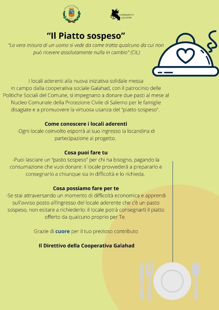 La cooperativa sociale Galahad, con il patrocinio delle Politiche Sociali del Comune di Salerno e in collaborazione con il Nucleo comunale della Protezione Civile di Salerno, presenta: “Il piatto sospeso”.