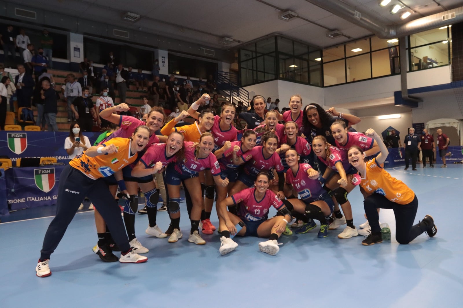 La Jomi Salerno mette in bacheca la sesta Supercoppa Italiana della sua storia. La formazione allenata in panchina da coach Laura Avram al Centro Tecnico Federale – “La Casa della Pallamano” di Chieti supera l’Alì Best Espresso Mestrino con il punteggio finale di 28 – 24 e si aggiudica il primo trofeo stagionale. Complimenti comunque anche alla formazione veneta che sino all’ultimo ha dato filo da torcere alle campionesse d’Italia in carica. Capitan Napoletano e compagne partono subito forte, portandosi avanti anche di quattro reti nei primi dieci minuti del match. Mestrino non ha nessuna intenzione di mollare, piano piano ricuce lo strappo. Il match viaggia così sui binari della parità. La Jomi Salerno allunga nel finale di tempo. La prima frazione di gioco si chiude così con le campane avanti con il risultato di 14 – 11. Nel secondo tempo il sette allenato da coach Laura Avram allunga sino al +6 poi l’episodio che riapre la gara: al 5′ infatti il neo acquisto Nerea Costanzo, che aveva avuto un buon impatto sul match, rimedia il cartellino rosso che rischia di cambiare le sorti del match. Capitan Napoletano e compagne sono costrette così a subire il ritorno delle avversarie. Mestrino prova a ricucire lo strappo senza però riuscire mai a sovvertire il parziale. Nel finale coach Avram concede spazio anche alle giovanissime Avagliano , Rossomando e Ciociano. Finisce 28 – 24, la Jomi Salerno alza al cielo la sesta Supercoppa della sua storia.