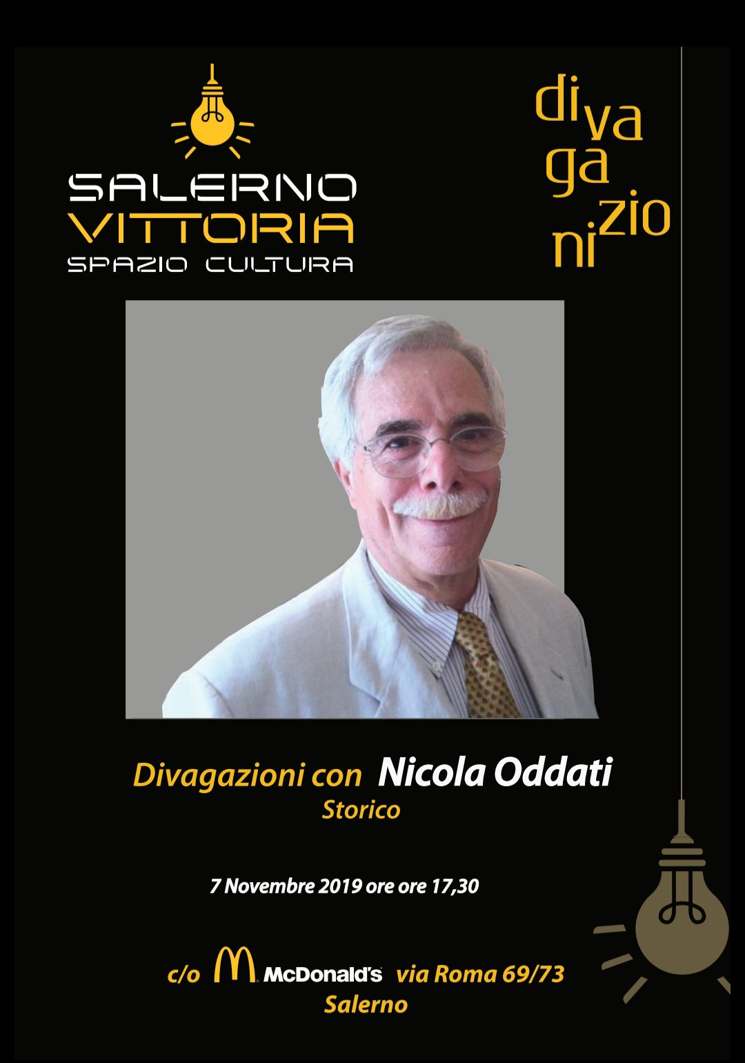 Giovedì 7 novembre alle ore 17.30, in via Roma, negli spazi di Palazzo Natella, da alcuni mesi sede del nuovo ristorante McDonald’s di Salerno, protagonista del secondo appuntamento in cartellone sarà il professore Nicola Oddati, storico, presidente del Museo dello Sbarco e Salerno Capitale, già ordinario di Storia Contemporanea e Storia dei partiti per oltre 40 anni all’Università degli Studi di Salerno.