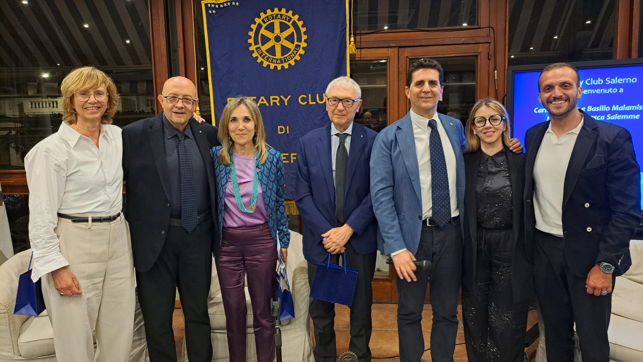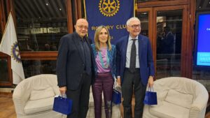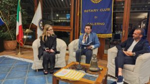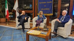 La seconda parte della serata, moderata con competenza, dalla giornalista Francesca Salemme, ha visto protagonisti due soci del Club cha hanno parlato di corretta alimentazione: il dottor Basilio Malamisura e il professor Carlo Vigorito. Il dottor Basilio Malamisura già Responsabile dell’Unità Operativa di Pediatria e del Centro di Celiachia del Polo di Cava de’ Tirreni dell’Azienda Ospedaliera Universitaria Ruggi di Salerno; attualmente Direttore del Centro per i Disturbi Digestivi e Alimento Correlati della “Casa di Cura Tortorella” di Salerno, ha spiegato il rapporto esistente tra l’alimentazione e il microbiota intestinale:” Rappresenta un vero e proprio organo che vive dentro di noi e la cui composizione è fortemente influenzata dall’alimentazione che noi seguiamo” Il dottor Malamisura ha citato una frase di Ludwig Feuerbach che scrisse: “L’uomo è ciò che mangia”. Con questa frase il filosofo tedesco gettava le basi della moderna nutrigenomica: una scienza che si occupa di studiare le correlazioni esistenti tra alimenti e genoma; attraverso la valutazione dei nostri geni e dei batteri che vivono nel nostro intestino che influenzano fortemente il nostro stato di salute”. Il dottor Malamisura ha parlato anche degli alimenti FODMAP:” Hanno la capacità di modificare il microbiota intestinale “e dei Fruttani:” Sono contenuti in alcuni cereali come frumento, orzo e segale. Se un individuo riduce il consumo di questi tre cereali, sta meglio, perché il suo intestino si muove meglio, digerisce meglio e produce meno gas”. Naturalmente Malamisura ha parlato anche del lattosio:” È uno zucchero che viene fermentato dalla flora batterica intestinale. Tutti noi siamo geneticamente predisposti all’intolleranza al lattosio”. Il professor Carlo Vigorito, Associato di Medicina Interna presso l’Università Federico II di Napoli ha parlato della corretta alimentazione necessaria per prevenire le malattie cardiovascolari:” Sia per la prevenzione primaria, per quelle persone che non hanno avuto alcuna manifestazione e che vogliono mantenere il loro stato di salute, sia per i pazienti che hanno già avuto qualche manifestazione di patologia cardiovascolare e vogliono evitare di averne un’altra. In entrambi i casi è importante seguire un’alimentazione a base di vegetali, di cereali integrali, di pesci oleosi, legumi, semi oleosi, frutta a guscio e, soprattutto, di fibre. Bisogna evitare le carni animali, soprattutto quelle processate, e di mangiare il cosiddetto cibo spazzatura, quello industriale che contiene molti grassi idrogenati che fanno aumentare il colesterolo e producono malattie cardiovascolari. Bisogna ridurre il consumo di sale; ridurre assolutamente il consumo di bevande zuccherate e bibite gassate e bere non più di un bicchiere di vino al giorno. Naturalmente non bisogna fumare e cercare di praticare una moderata attività fisica. In definitiva bisogna seguire i dettami della “Dieta Mediterranea”. Per quelli che hanno già avuto una patologia cardiovascolare, questi consigli devono essere seguiti in modo più intenso”. Ospite della serata, salutata dal Prefetto del Club, Alessandro Ruggiero, la socia rotariana olandese del “Rotary Club Twent Zuid AM” di Hengelo.