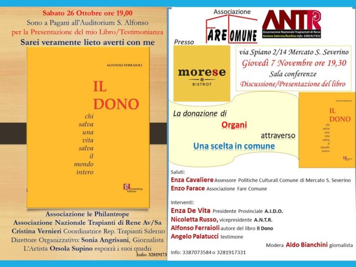 Il prossimo 26 ottobre alle ore 19,00 presso l’Auditorium S. Alfonso in Pagani, con la collaborazione del comune, continua il percorso del libro/testimonianza “Il Dono” che vede subito dopo, il 28 dello stesso mese in Polla una ulteriore presentazione, con la collaborazione dell’università della terza età, per ritornare il 7 novembre alle ore 19,30 di nuovo a Mercato S. Severino, Città di residenza dell’autore con la collaborazione dell’Associazione Fare Comune. Una grande rete è cresciuta nel tempo, formata da Associazioni, Enti, Scuole, Parrocchie e singoli, supportati dall’inizio dall’AIDO e dal dott. Paride De Rosa, Primario del reparto Trapianti di Salerno, intorno al libro, da cui ne è nato uno spettacolo teatrale e una Via Crucis, per diffondere in ogni momento e luogo l’importanza delle donazione degli organi attraverso soprattutto le testimonianze, insieme in un vero e proprio cammino verso la responsabilità per la vita, in quanto si parla in effetti di Vita che rinasce, in quanto da una morte che comunque sarebbe avvenuta, possono vivere altre persone pronte ad essere travolte dalla stessa. Avremo ancora una presentazione il 30 novembre a Scafati e tanto ancora è in definizione entro la fine di quest’anno. Previsto anche un premio come autore per l’impegno civile/sociale attraverso Il Dono, ancora due rappresentazioni teatrali con lo spettacolo ricavato da esso.