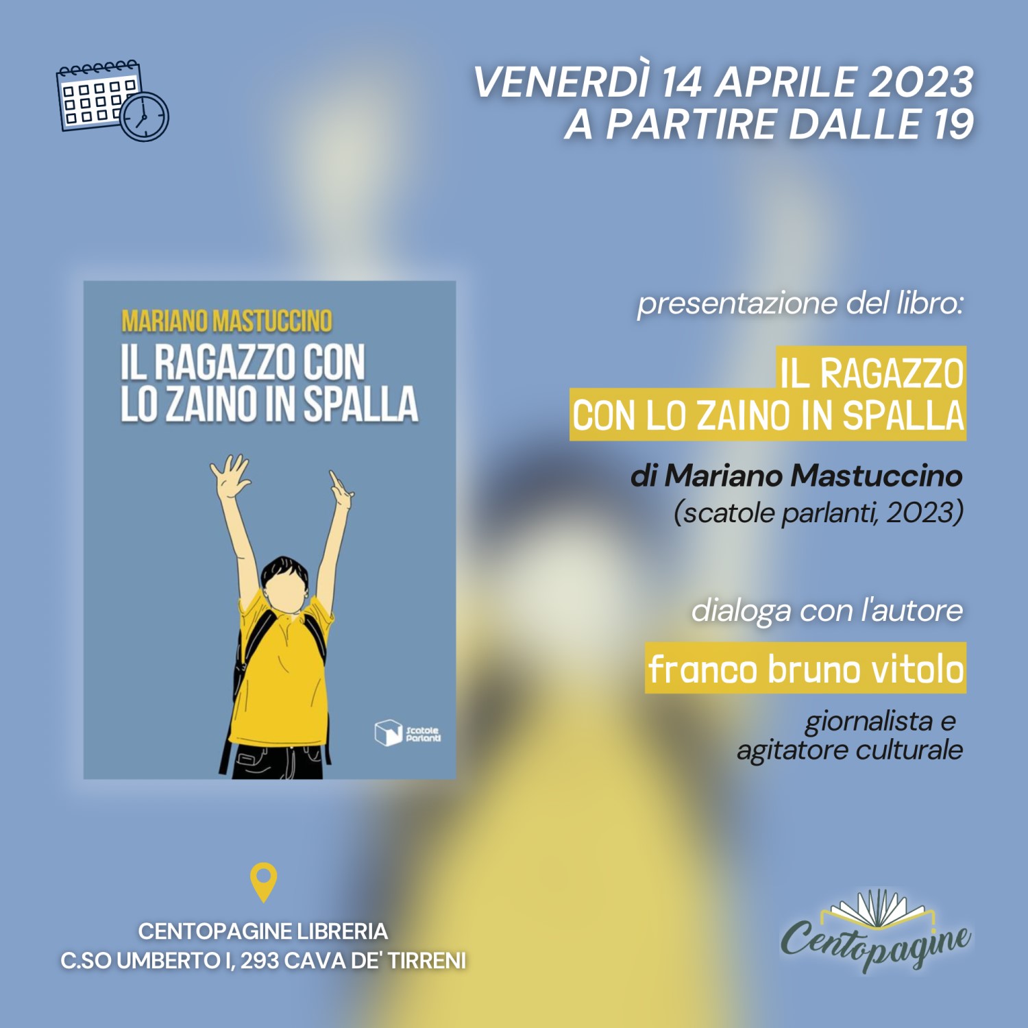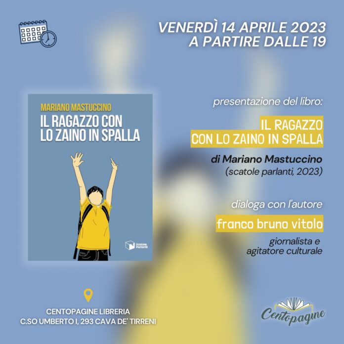 È in libreria “Il Ragazzo con lo zaino in spalla”, la prima raccolta di racconti di Mariano Mastuccino pubblicata dalla casa editrice Scatole Parlanti (collana Soffi, pp. 78, euro 12), che verrà presentata venerdì 14 aprile dalle ore 19 alla Libreria Indipendente Centopagine in corso Umberto I, 293. Con l’autore dialogherà il giornalista Franco Bruno Vitolo.