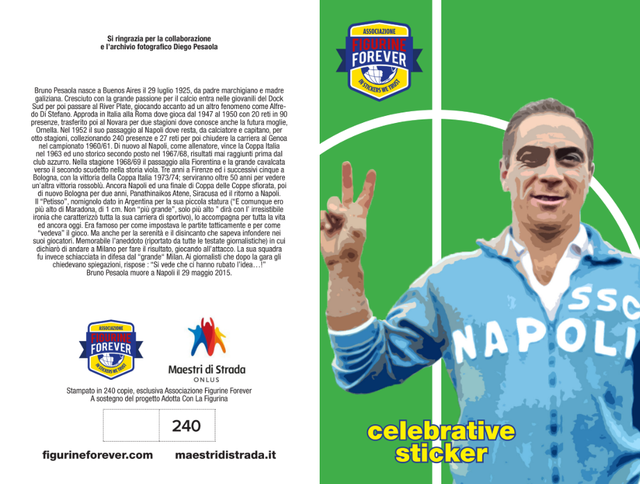 Le copie numerate sono 240, come le partite disputate dal Petisso con la maglia del Napoli: un omaggio simbolico e affettuoso per i collezionisti e gli appassionati. La figurina sarà disponibile in due versioni, che ritraggono Pesaola come giocatore e come allenatore.