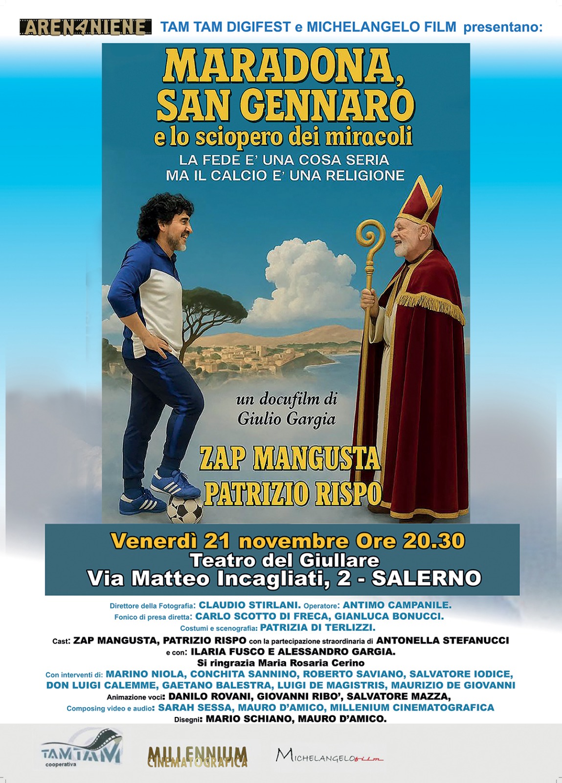 Alla presentazione seguirà la proiezione del docufilm “Maradona, San Gennaro e lo sciopero dei miracoli”, diretto da Giulio Gargia, che sarà presente in sala. Il film vede tra i protagonisti Patrizio Rispo e Zap Mangusta (Diego Pesaola, figlio del Petisso), nel ruolo di Maradona.
