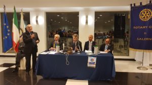 Dopo i saluti del Vice Presidente del Club, Raffaele Brescia Morra, che ha ricordato alcuni dei tanti progetti di carattere sociale promossi dal Club, non solo sul territorio salernitano, il Segretario Giulio Trimboli, ha letto i messaggi inviati dal Presidente Internazionale Barry Rassin e dal Board Director del Rotary International, Francesco Arezzo.