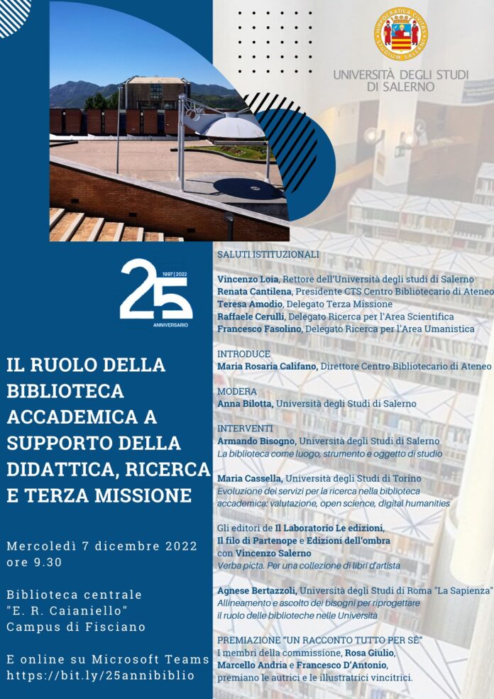 In occasione del venticinquennale dell’inaugurazione della biblioteca centrale “E. R. Caianiello”, mercoledì 7 dicembre, presso la Biblioteca umanistica dell’Università degli Studi di Salerno, a partire dalle ore 9.30, si terrà la giornata di studio Il ruolo della biblioteca accademica a supporto della didattica, ricerca e terza missione.
