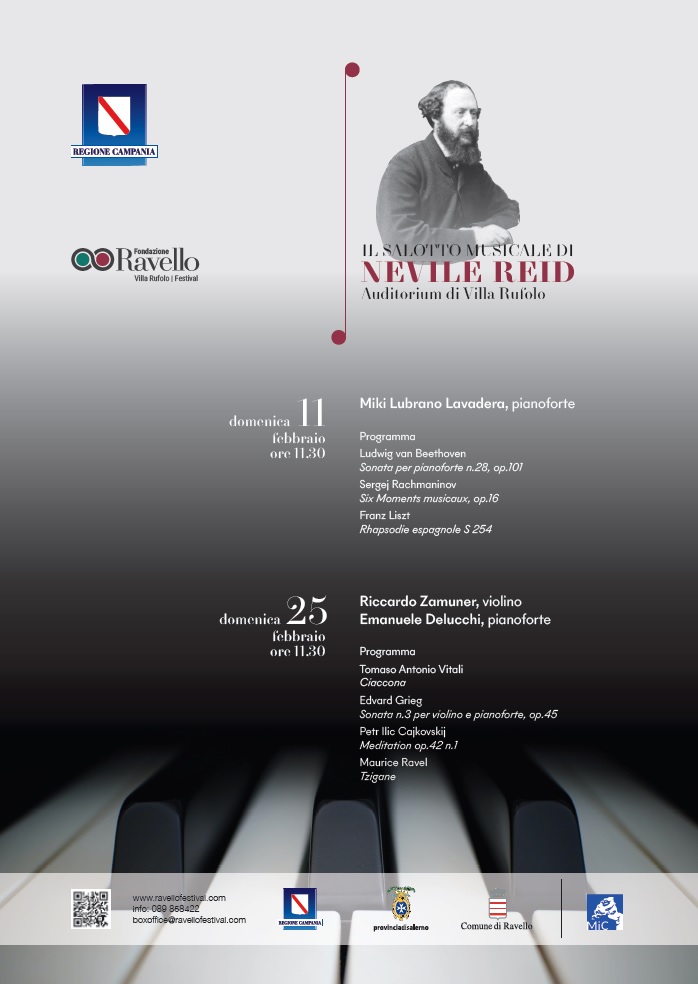 Dopo il prologo dello scorso dicembre, promosso nell’ambito de “Il Natale di Ravello 2023”, al via domenica 11 febbraio (ore 11.30) presso l’Auditorium di Villa Rufolo, la rassegna musicale “Il salotto musicale di Nevile Reid” organizzata dalla Fondazione Ravello e dedicata alle giovani e più qualificate leve dell’odierno concertismo e non solo. I protagonisti che daranno vita al lungo cartellone sono in prevalenza musicisti formati nei conservatori campani ai quali si uniranno anche interpreti e personalità di più consolidata fama.