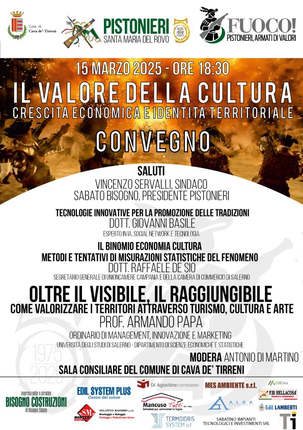 Al convegno interverrà Giovanni Basile, esperto in AI, Social Network e Tecnologia, che focalizzerà l’attenzione sull’importanza delle nuove tecnologie digitali e del loro impatto nella valorizzazione delle tradizioni locali. Sul binomio economia e cultura e sui metodi e tentativi di misurazione statistica del fenomeno sarà incentrato, invece, l’intervento di Raffaele De Sio, segretario generale di Unioncamere Campania e della Camera di Commercio di Salerno, mentre sulle strategie e best practice per rendere il patrimonio culturale un volano di sviluppo economico si soffermerà Armando Papa, ordinario di Management, Innovazione e Marketing all’Università degli Studi di Salerno.