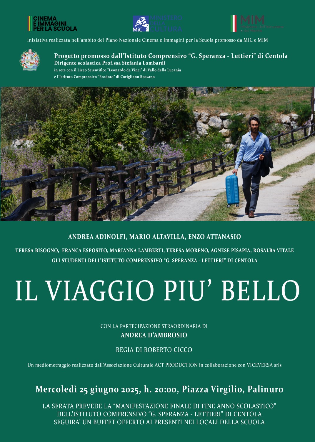 Il mediometraggio, diretto da Roberto Cicco e realizzato dall’Associazione culturale Act Production in collaborazione con la Società di produzioni cinematografiche Viceversa, vede quali attori gli studenti dell’Istituto Comprensivo “Speranza – Lettieri” insieme ad alcuni attori professionisti, tra cui Andrea Adinolfi, Mario Altavilla ed Enzo Attanasio. La lavorazione del film ha consentito agli studenti di sperimentare le tecniche di produzione di un lavoro cinematografico su un set, avendo così anche la possibilità di provare a cimentarsi nelle varie mansioni che servono in una situazione del genere (aiuto regia, addetto al ciak, segretario di edizione ecc). Nella serata del 25 giugno parteciperà anche il noto regista Andrea D’Ambrosio, da ultimo autore del documentario “I Cilentenari” che riguarda il “caso” degli ultracentenari cilentani. La decisione di partecipare all’avviso pubblico dei due Ministeri nasce nell’a.s. 2023/2024 e risulta pienamente coerente con la vision e la mission dell’Istituto diretto dalla Prof.ssa Stefania Lombardi, che perseguono il successo formativo di ogni alunno partendo dalla conoscenza e valorizzazione delle proprie radici storiche, familiari, culturali, antropiche per sviluppare i propri talenti e proiettarsi, grazie anche alle nuove tecnologie, verso la realtà italiana, europea a mondiale.