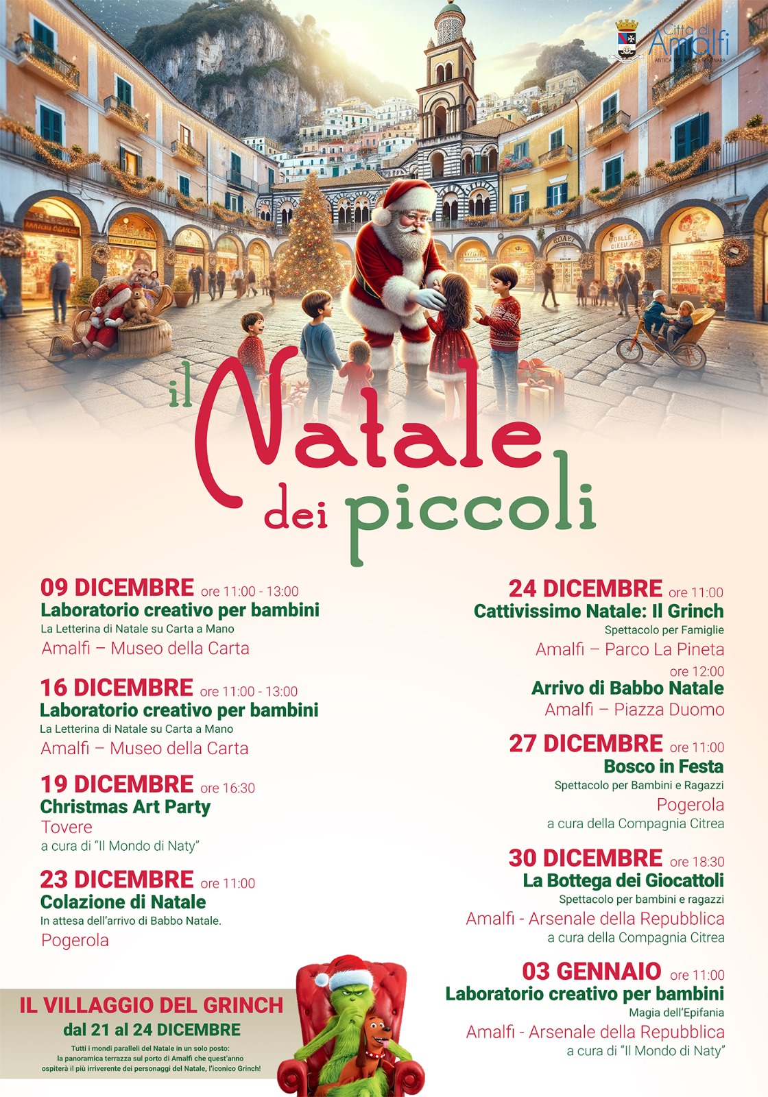 “È stata un’esperienza entusiasmante anche per noi vedere ogni bimbo realizzare il suo foglio di carta pregiata su cui scrivere la propria lista dei desideri da spedire a Babbo Natale. Un’occasione di trasmissione di un sapere antico. E poi ci sarà tantissimo divertimento – afferma la Consigliera agli Eventi, Enza Cobalto – Il Villaggio del Grinch, come tutti gli eventi in programma ad Amalfi, sarà ad ingresso gratuito, perché tutti i piccoli devono sperimentare la gioia e l’allegria. Sarà aperto tutti i giorni, fino ad arrivare alla Vigilia del 24 dicembre (h 10:00 – 13:00 e 16:00 – 19:00, Parco la Pineta) con lo spettacolo “Cattivissimo Natale”. La terrazza sul mare del porto di Amalfi sarà soprattutto location di tanti laboratori a tema che si alterneranno di giorno in giorno: i bimbi prepareranno il panettone e decorreranno i biscotti. E poi ci sarà il mago dello zucchero filato, le caldarroste e tanti show per ridere insieme e sognare insieme. Avremo una super colazione sabato 23 dicembre alle ore 11.00 a Pogerola, tutti insieme tra giochi e tanti dolcetti aspettando Babbo Natale. Non mancheranno gli spettacoli teatrali, come sempre pensati per riflettere sui temi sociali in maniera leggera e con un linguaggio vicino ai temi dell’infanzia e della pedagogia dello sviluppo. Infine se è vero che l’Epifania tutte le feste porta via, di sicuro noi ci prepareremo alla Befana con un laboratorio straordinario per creare la nostra calza da zero! Per cui tanta creatività e tanta allegria”.