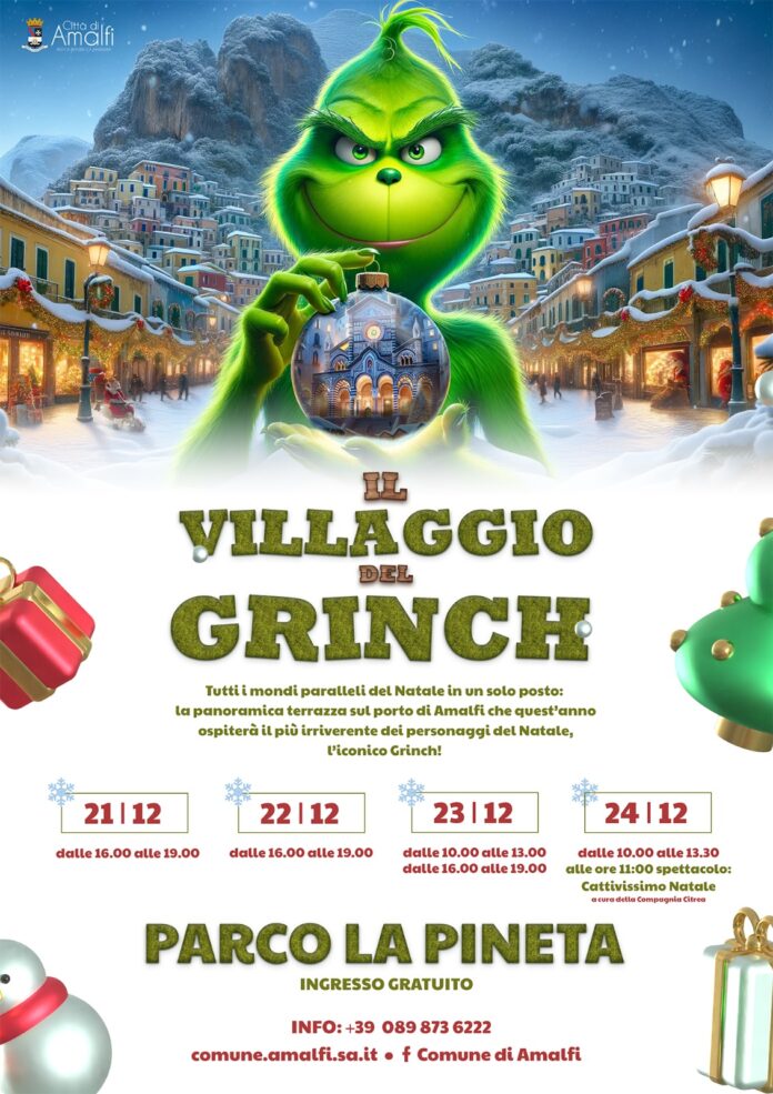 Si respira un’atmosfera effervescente in Costa d’Amalfi per uno degli eventi più attesi del programma natalizio promosso dall’Amministrazione Comunale di Amalfi, guidata dal Sindaco Daniele Milano: l’inaugurazione del Villaggio del Grinch, il più iconico, dissacrante e dirompente personaggio del Natale, adorato dai bambini, record d’incassi al cinema, che tra laboratori creativi, cantastorie, elfi pasticcioni, zucchero filato, spettacoli teatrali ed esilaranti sorprese conquisterà tutti, adulti e piccini.