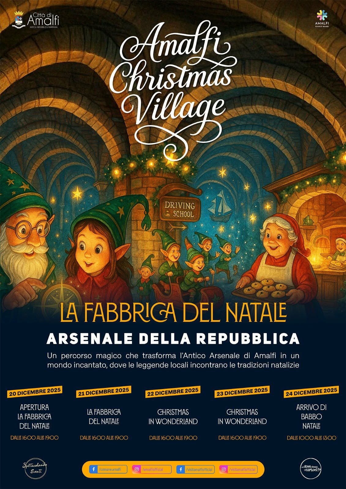 Tutta la magia delle feste sta per rivivere nell’evento più atteso dai bambini. Ritorna Amalfi Christmas Village: un percorso magico che trasforma l’Antico Arsenale della Repubblica Marinara in un mondo incantato, dove le leggende locali incontrano le tradizioni natalizie. Un format, che include al suo interno diversi momenti, inserito nel Natale dei Piccoli, rassegna ideata dall’Amministrazione Comune guidata dal Sindaco Daniele Milano, pensata esclusivamente per i bimbi, come sempre ad ingresso gratuito.