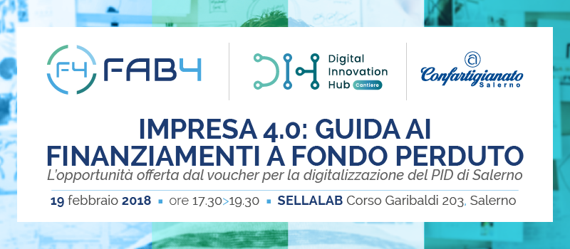 - Le opportunità offerta dal Bando voucher digitali Impresa 4.0 (I4.0)erogato dal Punto Impresa Digitale (PID) della Camera di Commercio di Salerno, la cui finalità è quella di promuovere l’utilizzo, da parte delle imprese del territorio, di servizi e/o soluzioni focalizzati sulle nuove competenze e tecnologie digitali. Il FAB4 DIH Confartigianato Salerno, in occasione dell’evento, raccoglierà l’interesse delle imprese che vorranno accedere a questa opportunità per lavorare ad un progetto comune.
