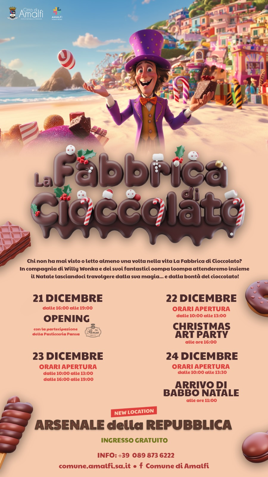 Chi saranno i bambini fortunati che riusciranno a trovare il biglietto d’oro per entrare nella Fabbrica di Cioccolato più famosa al mondo? Ladies and gentleman, pronti a tuffarvi nell’atmosfera magica che sabato 21 dicembre 2024 alle ore 16 si aprirà all’Antico Arsenale di Amalfi?