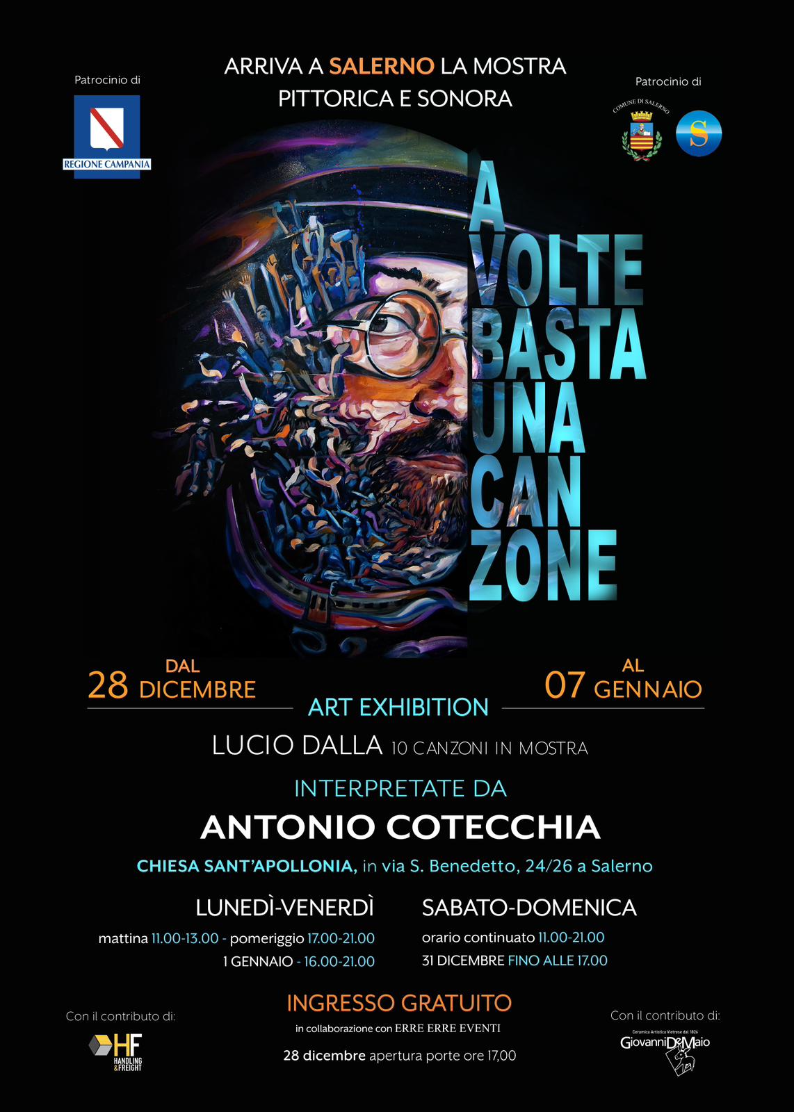 Arriva a Salerno “A volte basta una canzone. Lucio Dalla 10 canzoni in mostra”, esposizione pittorica e sonora del pittore e urban artist Antonio Cotecchia che si terrà dal 28 dicembre al 7 gennaio nella chiesa di Sant’Apollonia con il patrocinio del Comune di Salerno e della Regione Campania, in collaborazione con Erre Erre Eventi.