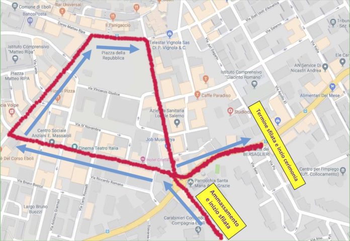 Prima dell’inaugurazione, la giornata avrà inizio con la celebrazione della Santa Messa nella vicina Chiesa Madonna delle Grazie, celebrata da don Rocco; alle ore 11 lo sfilamento dei radunisti, lungo le strade cittadine; alle ore 11.30 alza Bandiera, con benedizione ed inaugurazione della piazza e del “Monumento del Bersagliere”, deposizione corona di alloro, interventi delle massime autorità. Il Monumento recherà una scritta, “Un uomo, un sacerdote, un pugno di ragazzi”, in ricordo del maestro Cudillo, di don Enzo Caponigro e dei ragazzi dei minibersaglieri. L’inaugurazione del Monumento del Bersagliere sarà anche l’occasione per ospitare, in concomitanza con il Ventennale della Sezione Bersaglieri di Eboli – Piana del Sele “Gen. Antonio Scrimieri”, il Raduno Interprovinciale dei Bersaglieri e di condividerne con essi i valori di amicizia, di coraggio e di attaccamento alla Patria. Un grande appuntamento, con l’arrivo ad Eboli di centinaia di persone, per il quale il comando della Polizia Municipale ha predisposto un dispositivo del traffico tale da ridurre al minimo i disagi alla circolazione, assicurando il tranquillo svolgimento del raduno interprovinciale dei Bersaglieri. Dalle 9 alle 13 ci sarà divieto di sosta in via Ceffato, via Sele, via Po, via Serracapilli,; nelle stesse ore divieto di transito in via Serracapilli. La circolazione rimarrà sospesa dalle 11 alle 12 per il grande raduno dei Bersaglieri nelle vie Madonna delle Grazie, Umberto Nobile, Giovanni Amendola, Giacomo Matteotti e Ceffato. Le arterie laterali saranno percorribili per far defluire la circolazione, con sistemazione di indicazioni agli automobilisti.