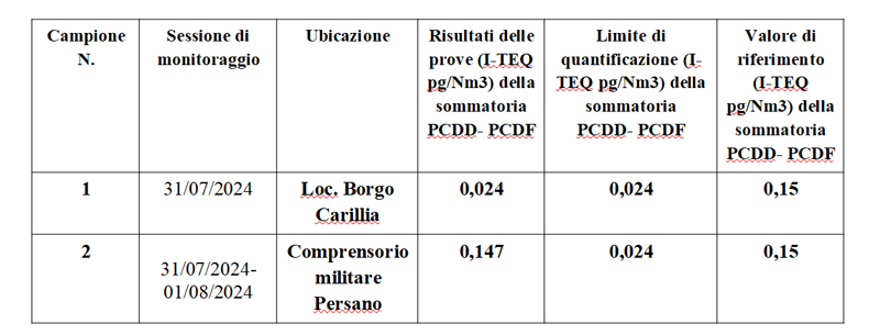 In particolare, dalla lettura della tabella, si evince un valore pari al limite di quantificazione per il campione della stazione di monitoraggio ubicata in località Borgo Carillia e un valore significativo, sia pure lievemente inferiore al valore di riferimento, per la stazione posta nel comprensorio militare di Persano.
