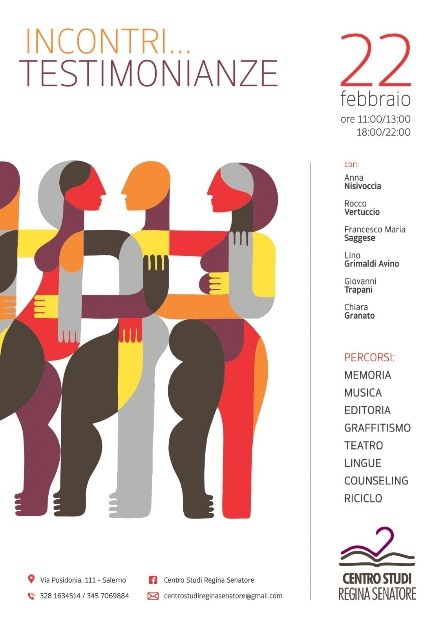 Sabato 22 febbraio ’20, dalle ore 11.00 alle 13.00 e dalle 18.00 alle 22.00, presso il “Centro Studi Regina Senatore” in via Posidonia 111 a Salerno, avrà luogo l’evento “INCONTRI E TESTIMONIANZE…”.