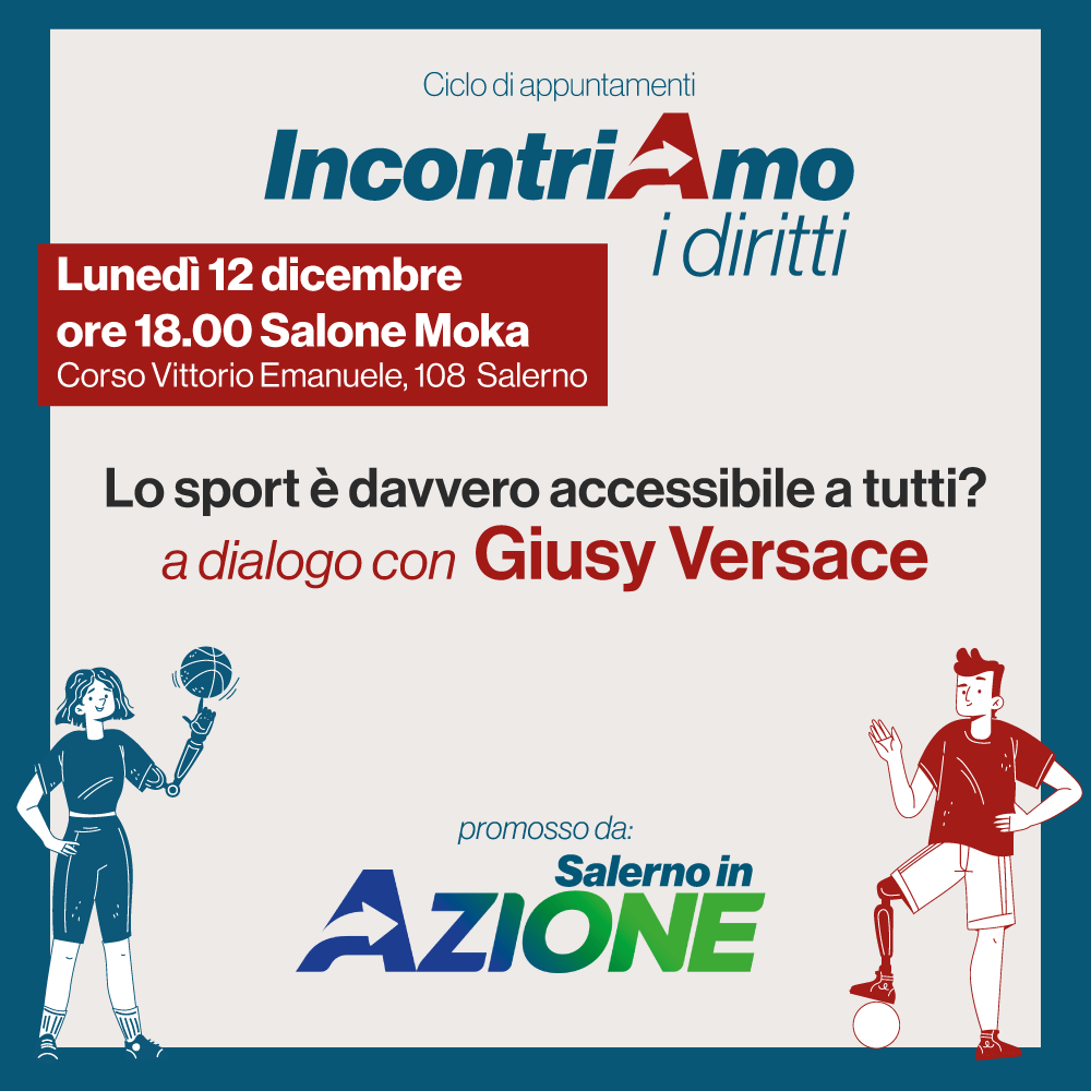 Siamo onorati di ospitare a Salerno Giusy Versace, Senatrice e atleta paralimpica, la quale ci darà modo di accendere i riflettori su una tematica che merita attenzione da parte di politica e opinione pubblica”, dichiara il Segretario cittadino Donato D’Aiuto.