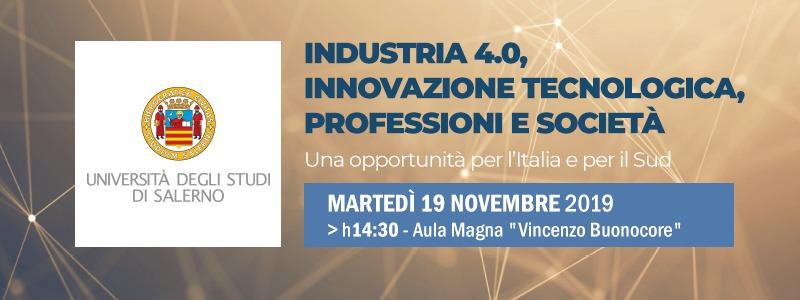 Questi i focus tematici al centro del dibattito “INDUSTRIA 4.0, innovazione tecnologica, professioni e società: una opportunità per l’Italia e per il Sud”, l’evento di Ateneo in programma martedì 19 novembre 2019 in Aula Magna “Vincenzo Buonocore” al campus di Fisciano (piano 0, Edificio A2).