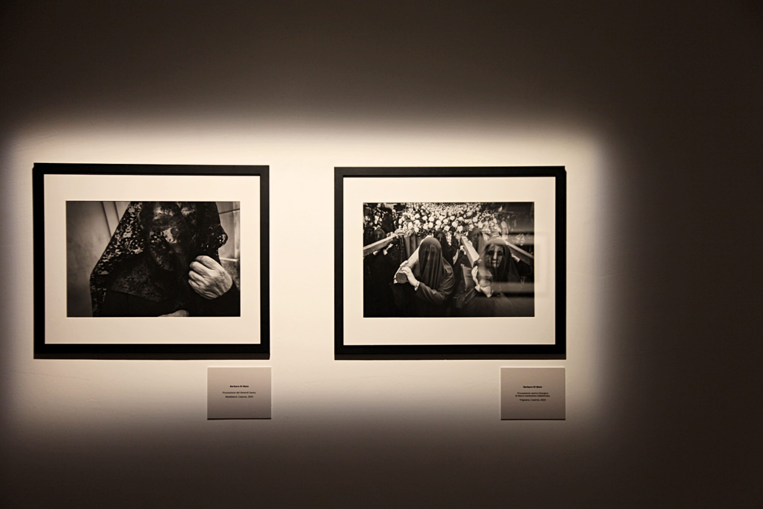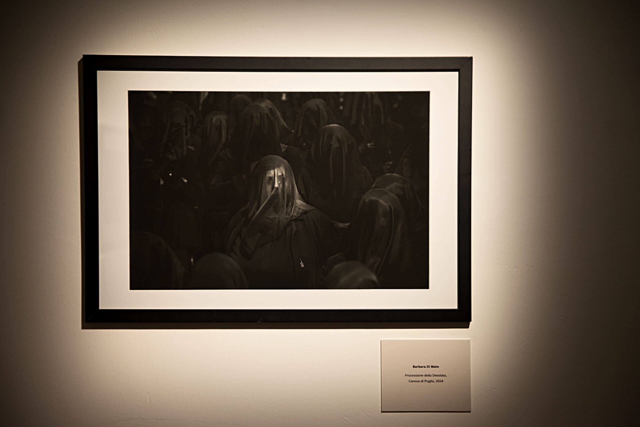 La Di Maio indaga da oltre dieci anni il rapporto tra rito, tradizione e memoria collettiva, con uno sguardo rivolto soprattutto al folklore campano. Al centro della sua ricerca c’è la figura femminile, custode silenziosa di gesti e saperi che attraversano il tempo. Nelle opere in mostra a Palazzo Fruscione, tratte dal progetto In nome della Madre, volti di donne emergono tra veli neri, simbolo di una condizione femminile stratificata, attraversata da dolore, fede e resistenza. Le figure in processione richiamano le donne cantate da Fabrizio De André in Via della croce: curve e silenziose, incapaci di nascondere il proprio tormento, ma partecipi di una compassione profonda. Soffrono accompagnando Cristo alla morte, mosse dalla riconoscenza verso chi, perdonando Maddalena, ha aperto per loro la possibilità di un destino diverso.