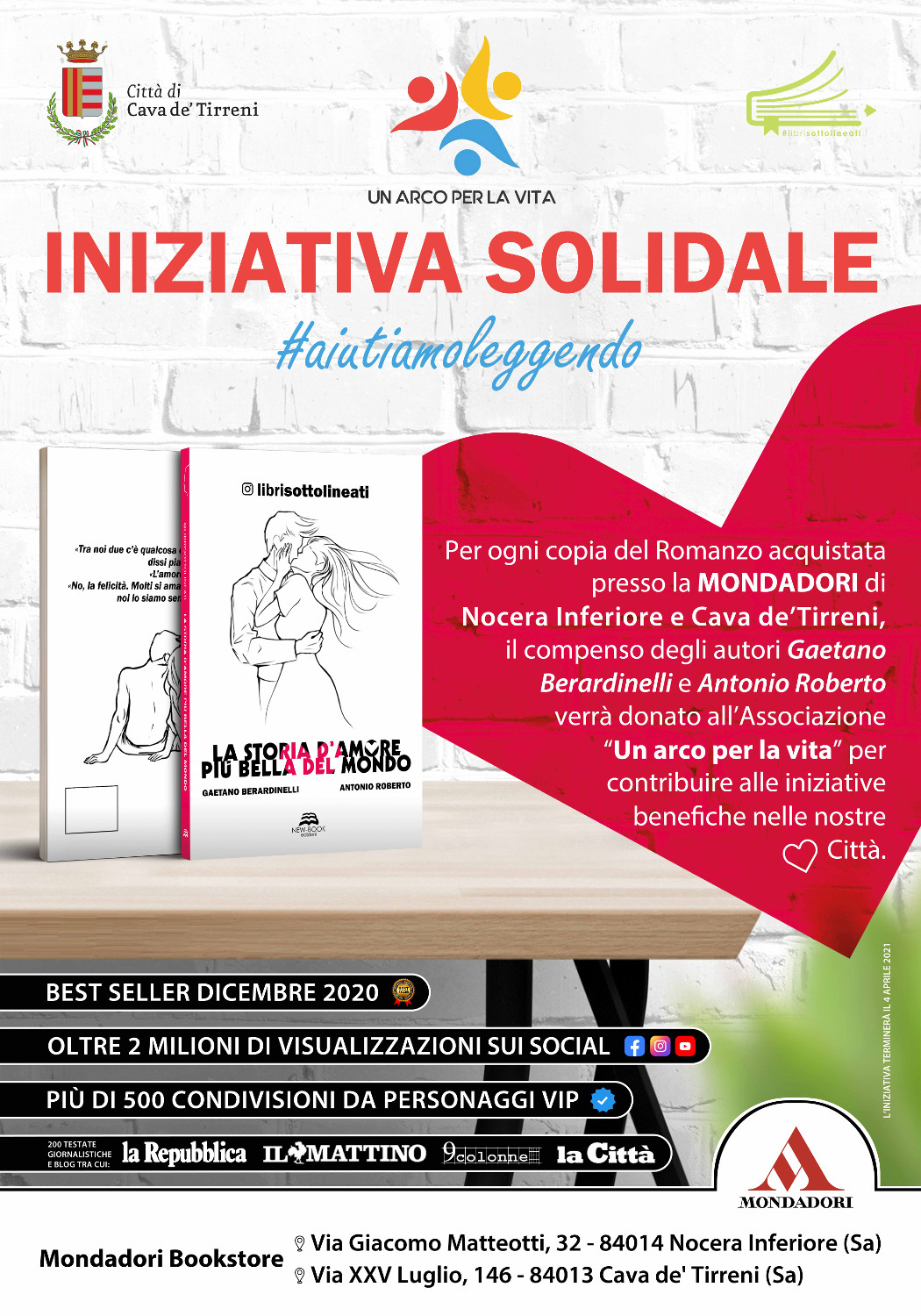 Ha preso il via, con il patrocinio morale del Comune di Nocera Inferiore e Cava de’Tirreni, l’iniziativa solidale “#aiutiamoleggendo” che ha lo scopo di devolvere il compenso degli autori campani de La storia d’amore più bella del mondo, all’Associazione Un arco per la vita. I due autori Gaetano Berardinelli ed Antonio Roberto hanno, infatti, deciso di donare il compenso del loro primo romanzo edito da New Book Edizioni, per sostenere il reparto di oncoematologia territoriale di riferimento delle due cittadine. La donazione è automatica per ogni acquisto del romanzo effettuato presso i punti vendita del Gruppo Mondadori di Nocera Inferiore e Cava de’ Tirreni entro il 4 aprile 2021.