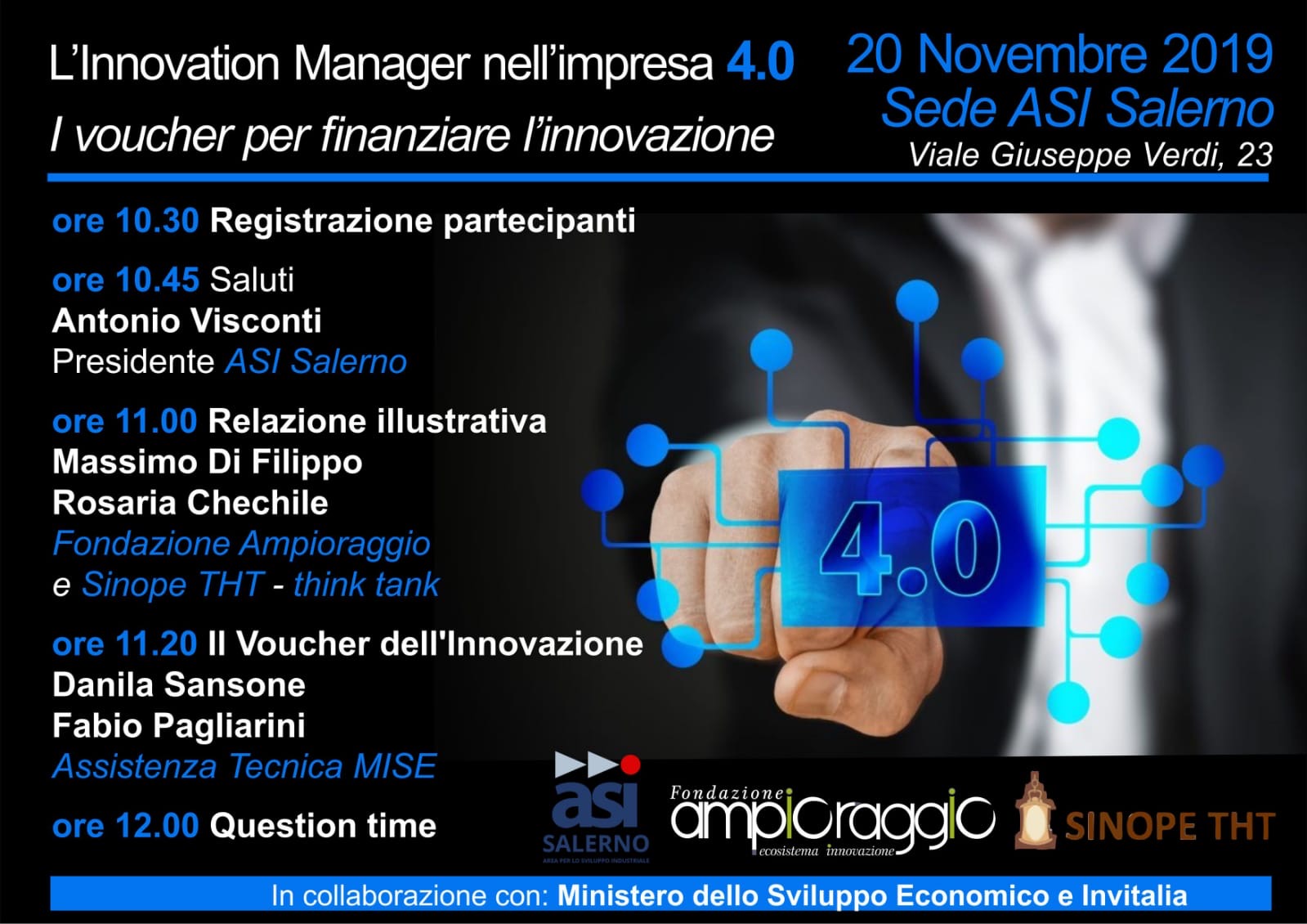 L’obiettivo del workshop, che si terrà mercoledì 20 novembre alle ore 10.30 presso la sede del Consorzio ASI di Salerno, viale Giuseppe Verdi n. 23, è illustrare, insieme ai tecnici del Ministero dello Sviluppo Economico, come presentare le domande da parte di imprese, PMI e reti d’impresa, ed evidenziare quali sono i vantaggi di inserire in azienda la figura dell’Innovation manager, qualificato e iscritto negli elenchi del Mise, affinché l’innovazione possa accadere.