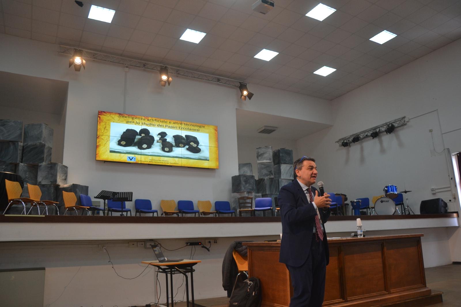 Di fronte ad una platea di studenti attenta e partecipe il prof. Del Mastro ha ripercorso l’affascinante storia delle scoperte ercolanesi e presentato le nuove frontiere raggiunte dagli studi della papirologia grazie al contributo delle più recenti tecnologie applicate alle scienze dell’antichità. La Dirigente Scolastica del Perito-Levi, Laura Maria Cestaro, sia nell’intervento di apertura sia a conclusione della lezione, ha sottolineato come le straordinarie potenzialità dell’IA, applicate al patrimonio materiale e culturale del nostro Paese e, in particolare, del nostro territorio, permettano di schiudere nuovi e impensati percorsi di studio nell’ambito umanistico e di arricchire con nuove letture ed interpretazioni la comprensione della civiltà classica.
