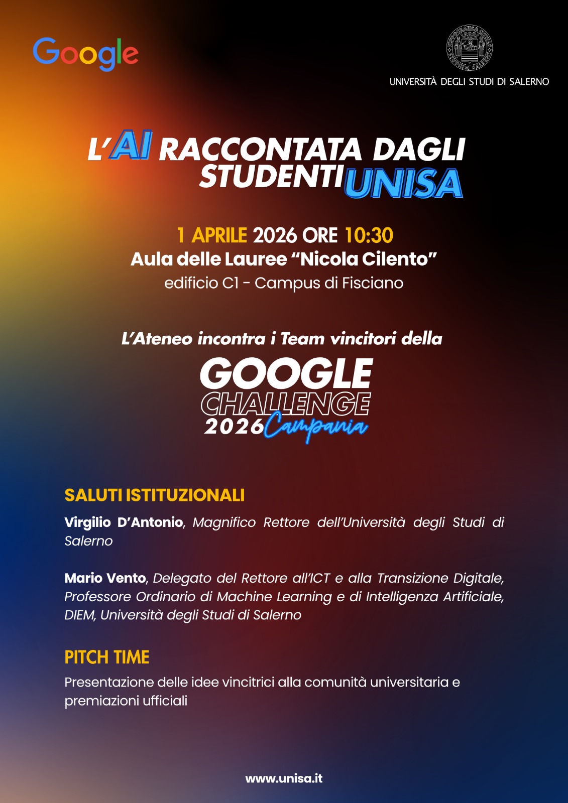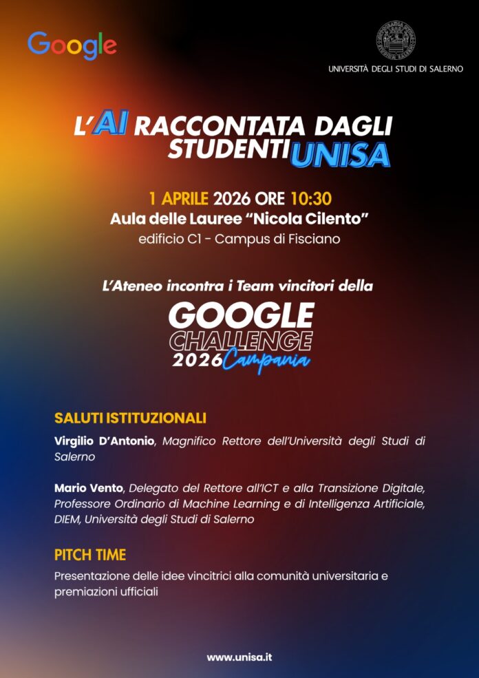 Mercoledì 1° aprile, dalle ore 10.30, in Aula “Nicola Cilento” al campus di Fisciano, l’Ateneo incontra i Team finalisti della Google Challenge Campania 2026, la competizione sull’utilizzo creativo e concreto di strumenti di Intelligenza Artificiale generativa, organizzata e promossa in collaborazione con Google.