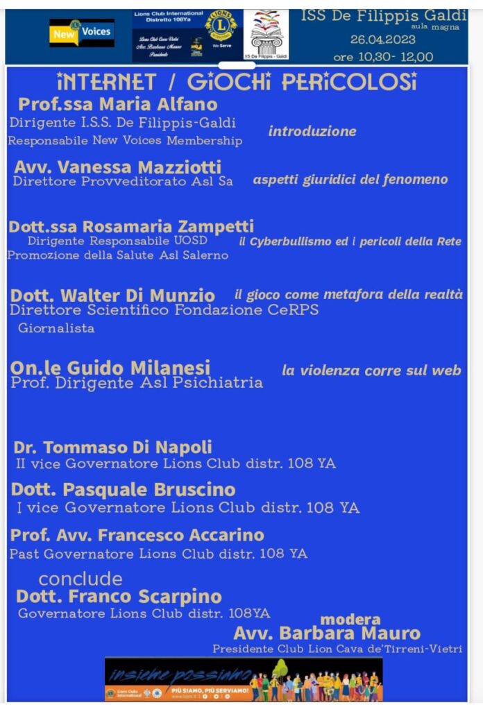 “Internet/Giochi pericolosi”. E’ il tema dell’incontro promosso dal Liceo De Filippis Galdi di Cava de’ Tirreni d’intesa con il Lions Club Cava-Vietri Distretto 108YA, nell’ambito del progetto educativo per il rafforzamento della prevenzione dalle dipendenze. Ricco ed articolato su diversi aspetti il programma degli interventi che avrà inizio stamattina, alle ore 10,30, nell’Aula Magna della sede Galdi di via R. Senatore, con la moderazione di Barbara Mauro, Presidente Lions Club. Dopo l’introduzione della Dirigente Scolastica del De FilippisGaldi, Maria Alfano, Responsabile New Voices Membership, seguiranno le relazioni di Vanessa Mazziotti, Direttore Provveditorato Asl, sugli aspetti giuridici del fenomeno, Rosamaria Zampetti, Dirigente Responsabile UOSD, sul Cyberbullismo e i pericoli della Rete, Walter Di Munzio, Direttore Scientifico Fondazione CeRPS, psichiatra, sul gioco come metafora della realtà, Guido Milanesi, Prof. Dirigente Asl Psichiatria, sulla violenza all’interno del web. Ulteriori spunti di riflessioni e dibattito saranno offerti dai Governatori del Lions Club, Tommaso Di Napoli, Pasquale Bruscino, Francesco Accarino mentre a Franco Scarpino saranno affidate le conclusioni del convegno. Presenti gli studenti della classe seconda dei cinque indirizzi del liceo cittadino.