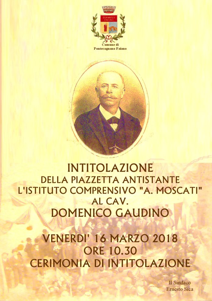 “Con orgoglio ed emozione – dichiara il Sindaco Ernesto Sica – onoriamo la straordinaria figura del cavaliere Domenico Gaudino, uno dei padri della Città di Pontecagnano Faiano. Con un’opera quotidiana di eccezionale rilievo e grazie alla sua esperienza anagrafica, civica e amministrativa sostenne, insieme a tanti altri uomini, come lui valorosi e autentici riferimenti, il processo di autonomia che portò alla nascita del nostro Comune creando le condizioni per il suo sviluppo. A lui dobbiamo tanto e in lui riconosciamo un grande esempio per noi e, in particolare, per le giovani generazioni”.